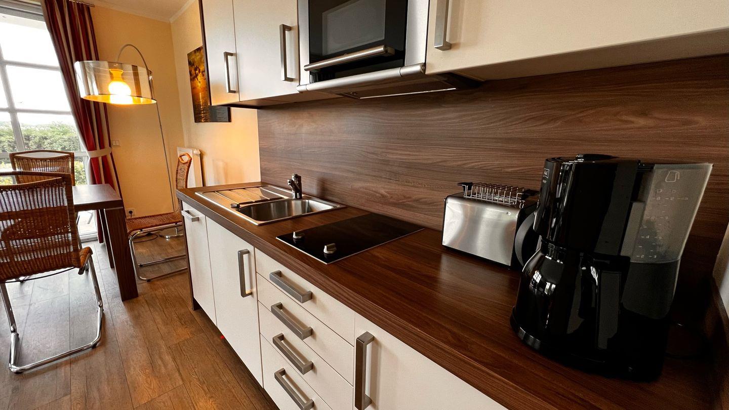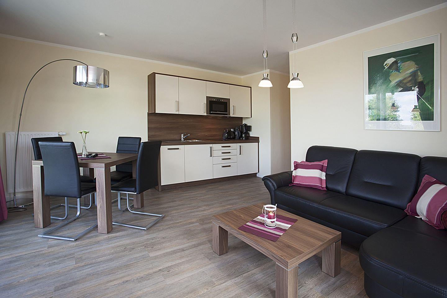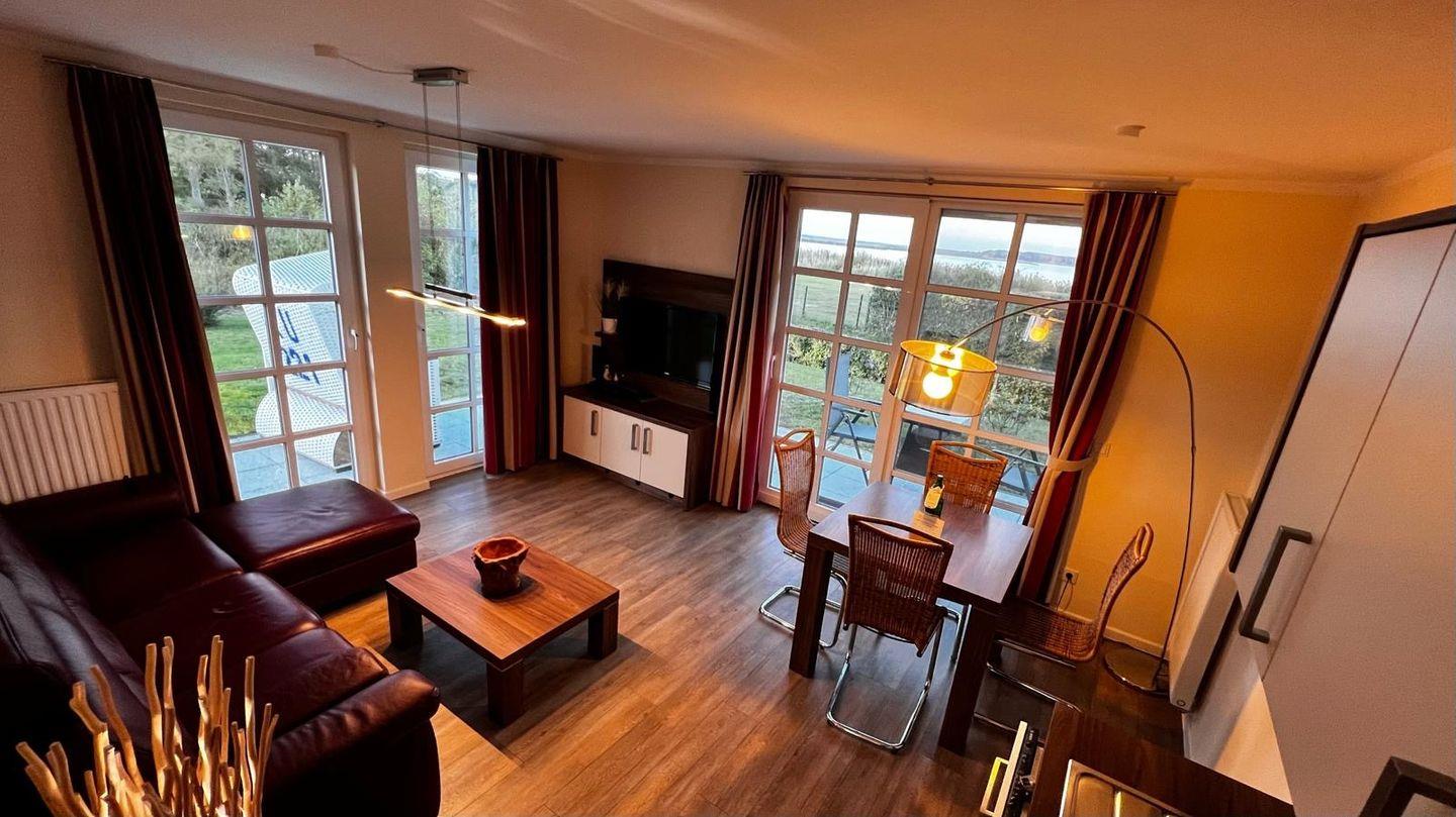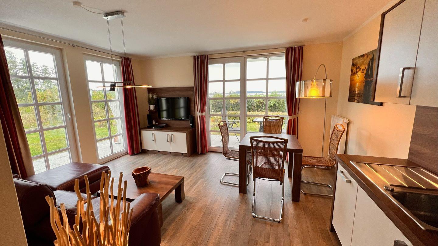 Schöner Urlaub zu zweit! Charmante 2-Raum-Wohnung mit vollwertigem Schlafzimmer und einer Größe von ca. 45m². Vollwertige Einbauküche mit Geschirrspüler und Mikrowellengerät. Mit der Terrasse im Erdgeschoß mit einem Blick in Richtung Achterwasser eignet sich die Wohnung perfekt für 2 Personen.