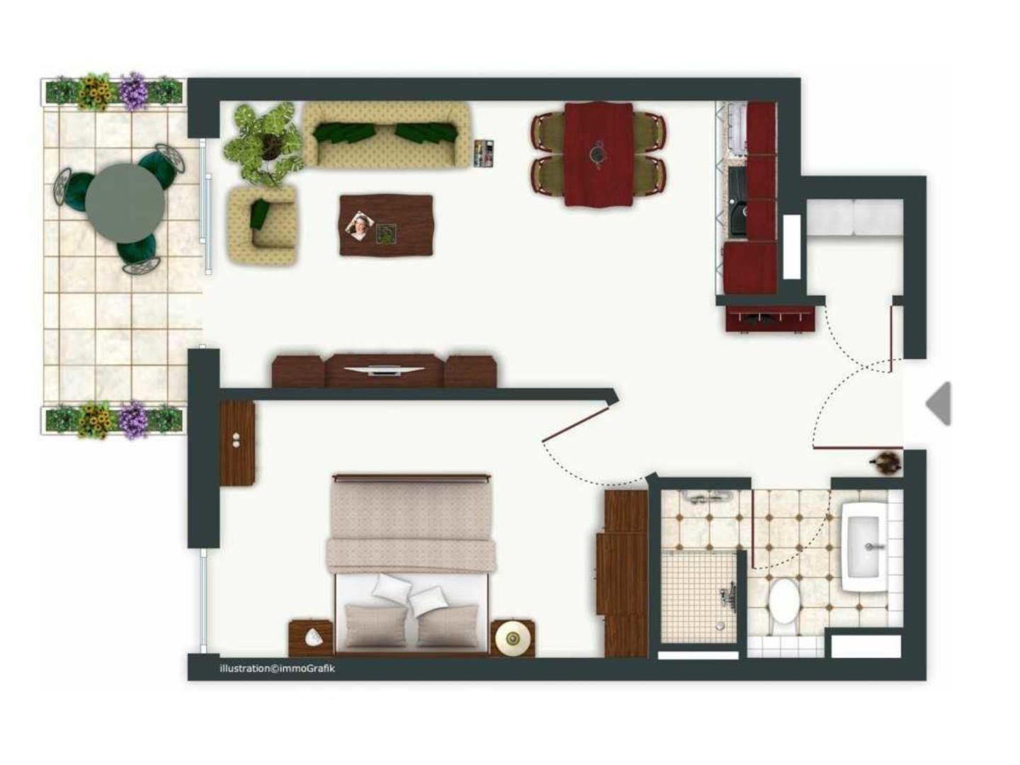 Auf großzügigen 44m² erwartet Sie ein vollwertiges Schlafzimmer sowie ein lichtdurchfluteter Wohnbereich mit Küche.