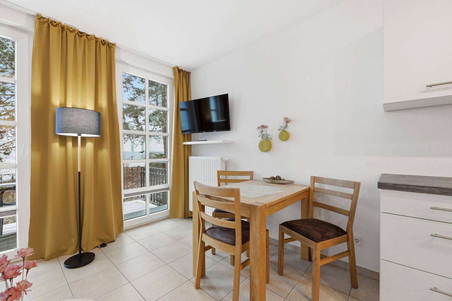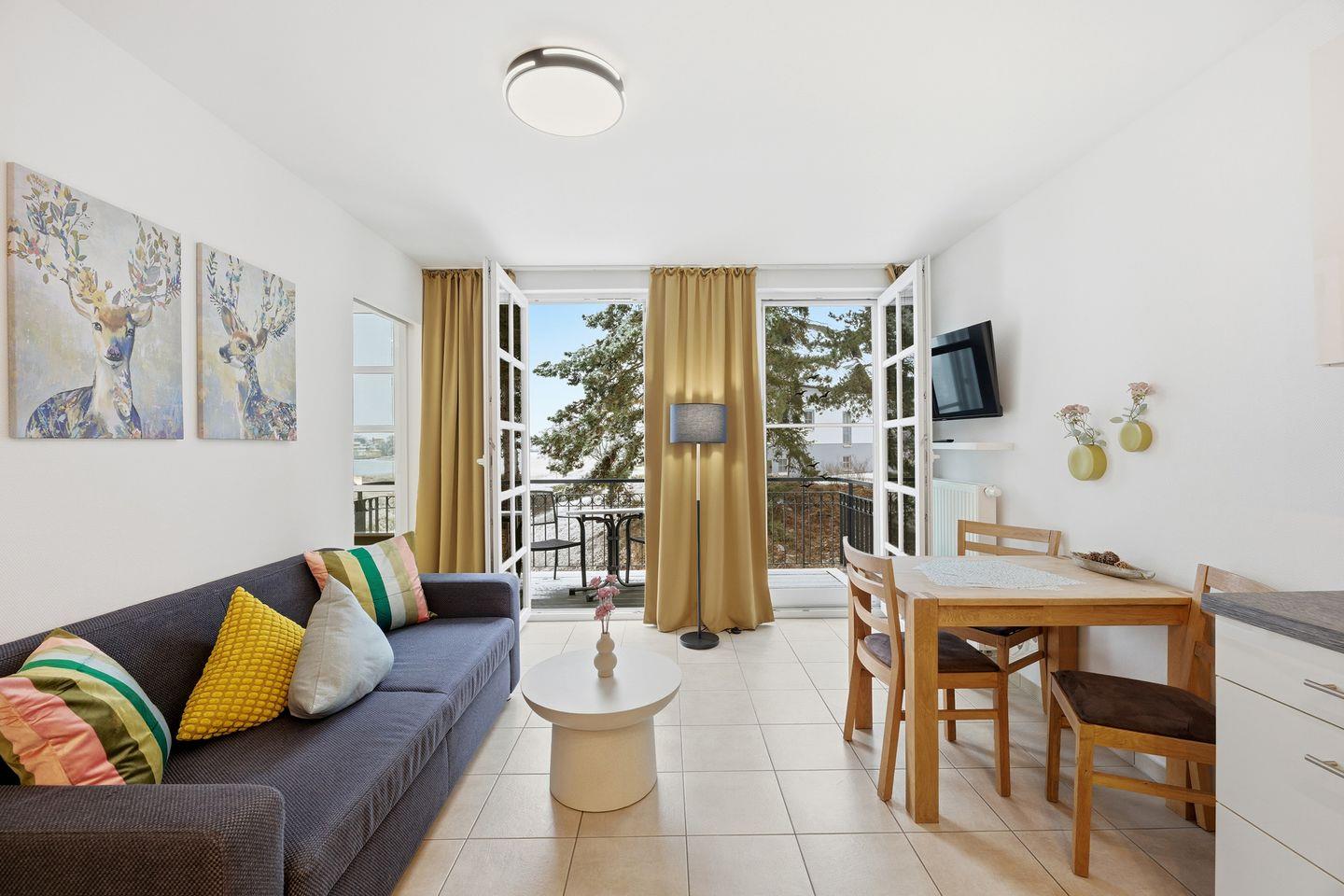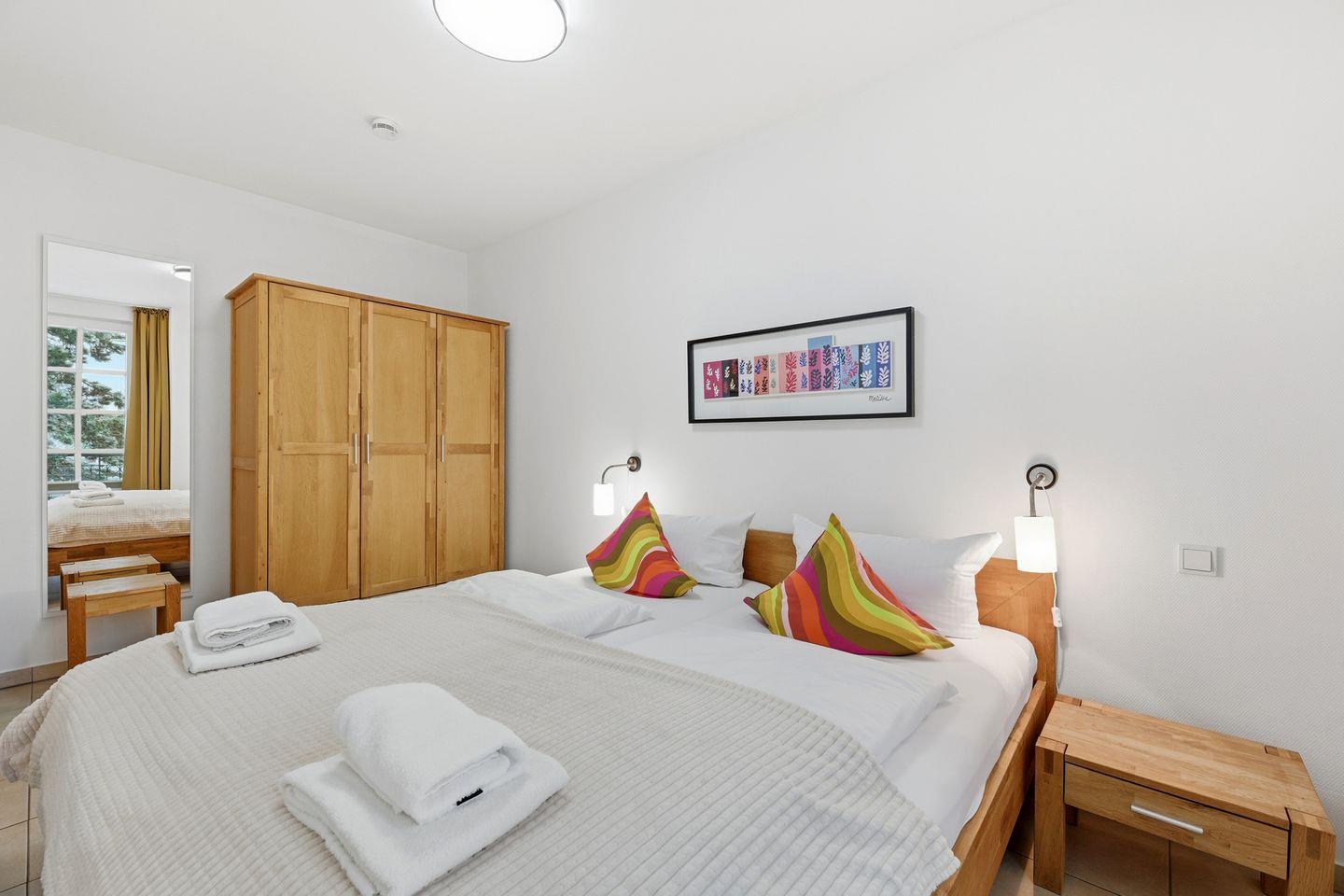 Ein vollwertiger Schlafzimmer mit einem Doppelbett sorgt für erholsame Nächte. Für Ihren Komfort sind die Betten bei der Anreise bezogen und Handtücher liegen bereit (Erstausstattung). In unserem gemütlichen Wohnbereich sowie auf unserem Balkon (mit Tisch und zwei Stühlen) mit Blick aufs Achterwasser haben Sie Gelegenheit, Ihre Urlaubstage entspannt z.B. bei einem Glas Wein ausklingen zu lassen.