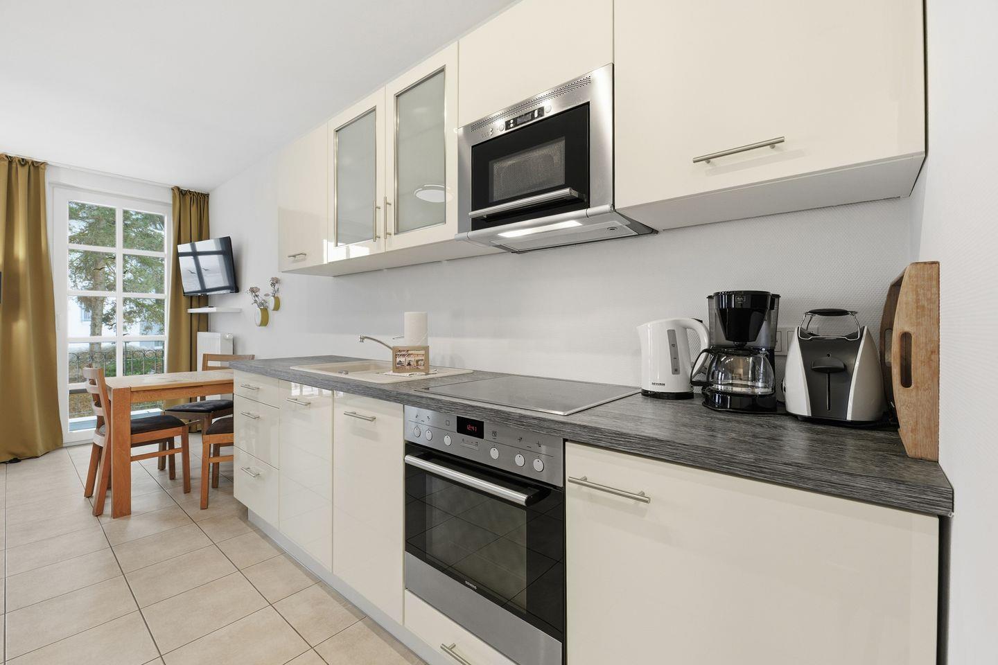Die gut ausgestattete Einbauküche verfügt über Kühlschrank mit Eisfach, Spülmaschine, Mikrowelle, Herd mit Ceran-Kochfeldern und Backofen sowie Dunstabzugshaube.