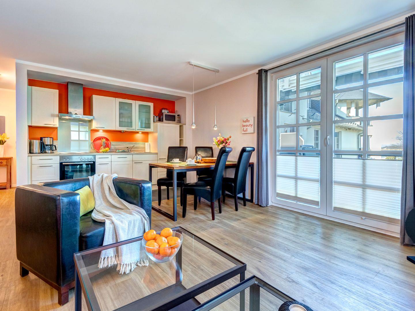 Diese exklusive Ferienwohnung ist mit stolzen 5 DTV-Sternen zertifiziert und bietet auf großzügigen 56m² einen Wohnbereich mit Terrasse, offene Küche sowie ein Schlafzimmer und ein Bad.