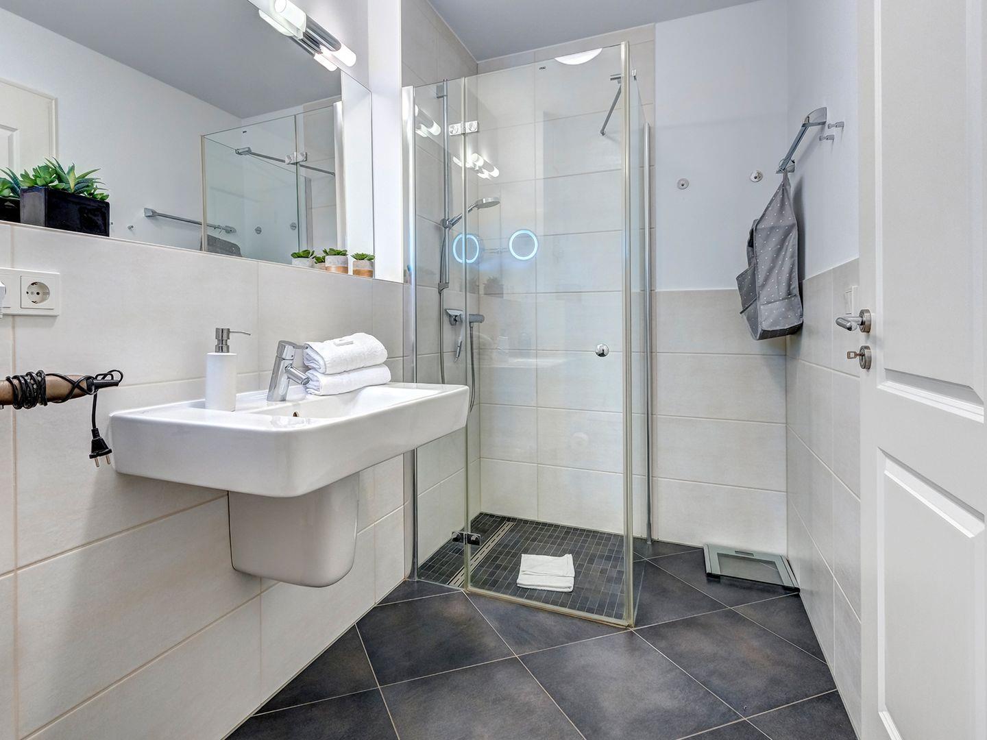 Das moderne Badezimmer beeindruckt nicht nur durch seine hochwertige Ausstattung, sondern auch durch eine ebenerdige Dusche sowie diverse Annehmlichkeiten, die Ihren Aufenthalt noch angenehmer gestalten. Wir haben an alles gedacht, damit Sie sich in unserer Wohnung rundum wohlfühlen können.