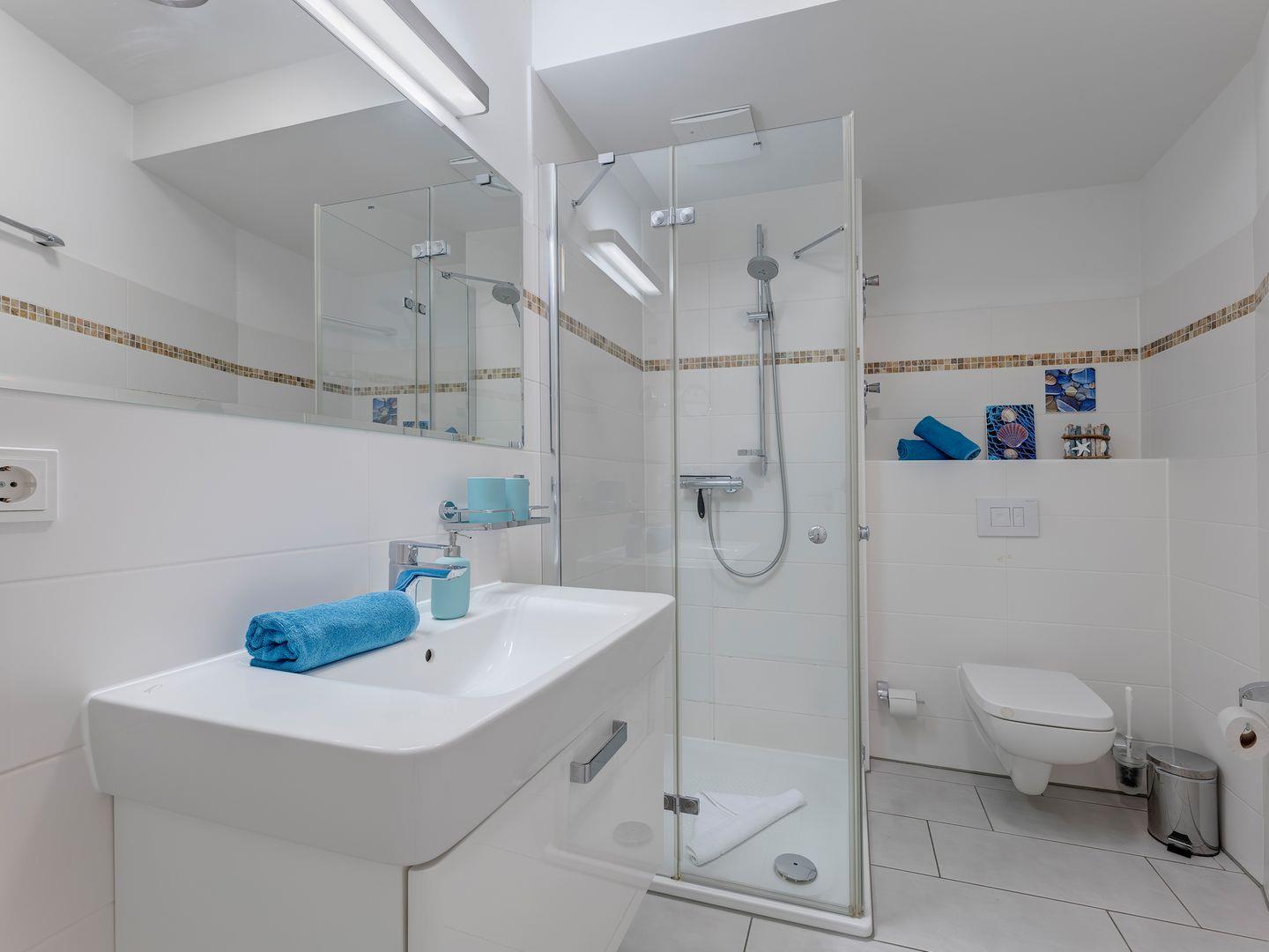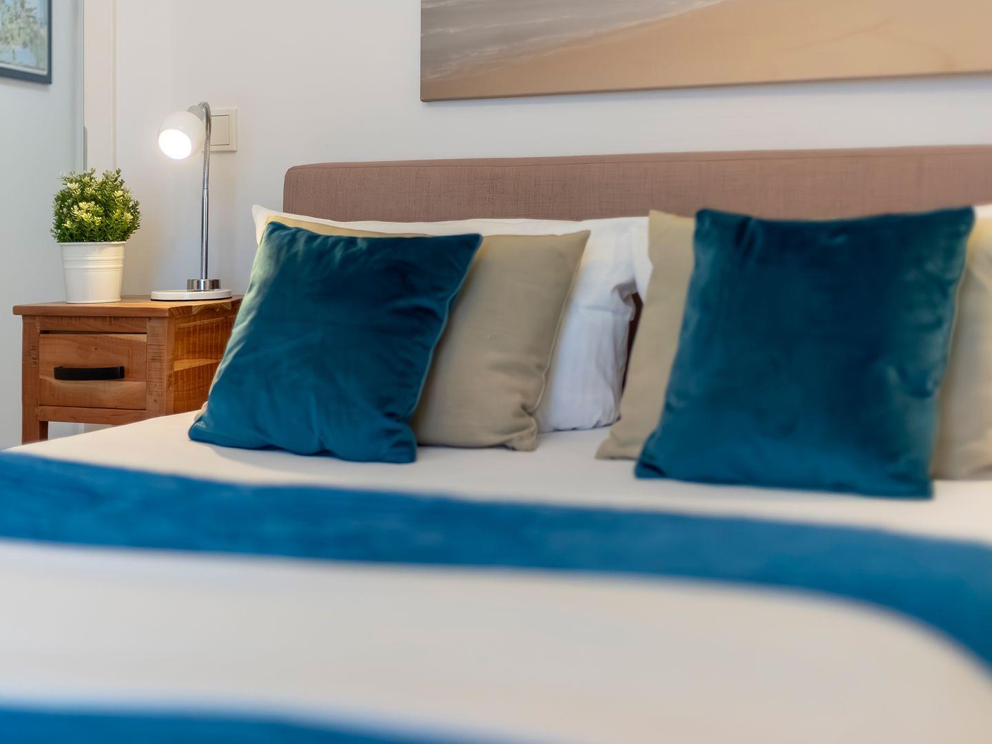 Nach einem erlebnisreichen Tag können Sie im traumhaften Schlafzimmer mit einem bequemen Hotel-Boxspringbett zur Ruhe kommen. Das Badezimmer ist mit Liebe zum Detail eingerichtet und verfügt unter anderem über eine bodentiefe Dusche, einen Kosmetikspiegel und einen Haartrockner.
