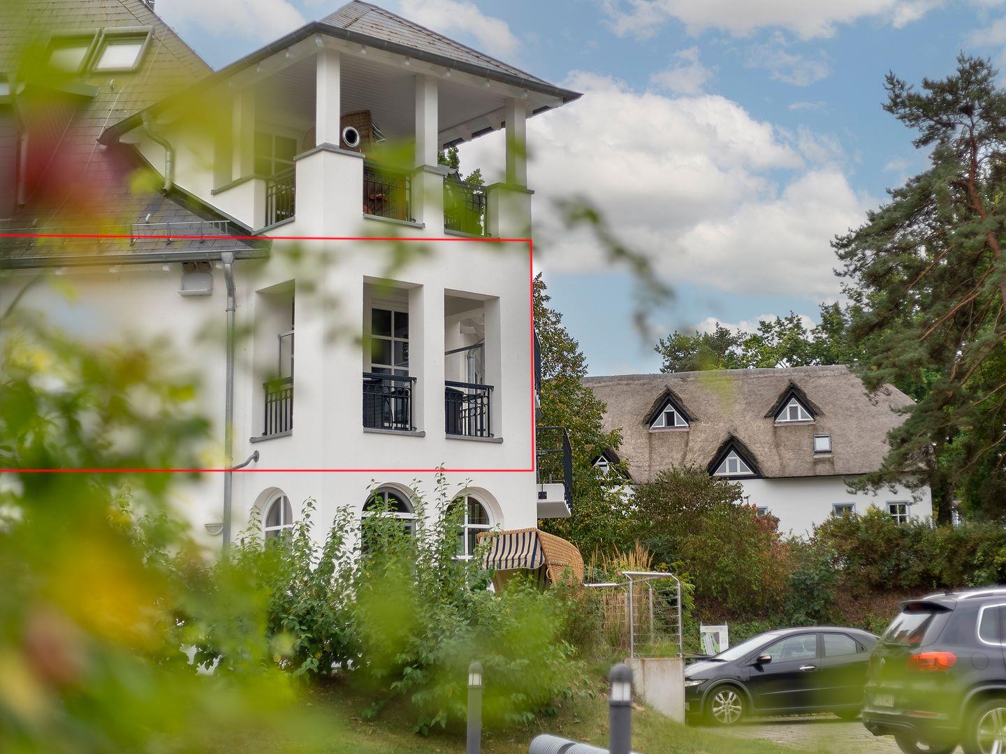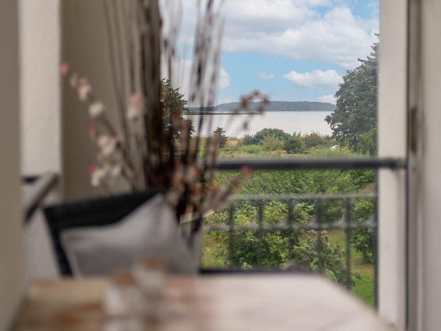 Vom geschützten Balkon aus genießen Sie einen herrlichen Blick aufs Achterwasser und den Düker, von Mittag bis in die Abendstunden.