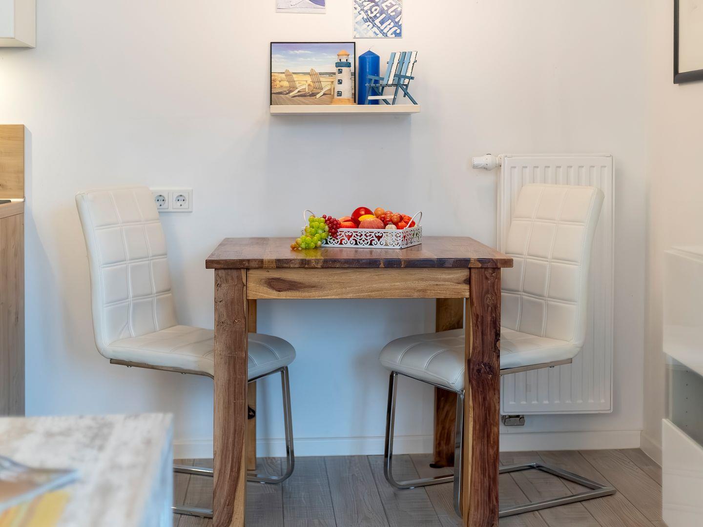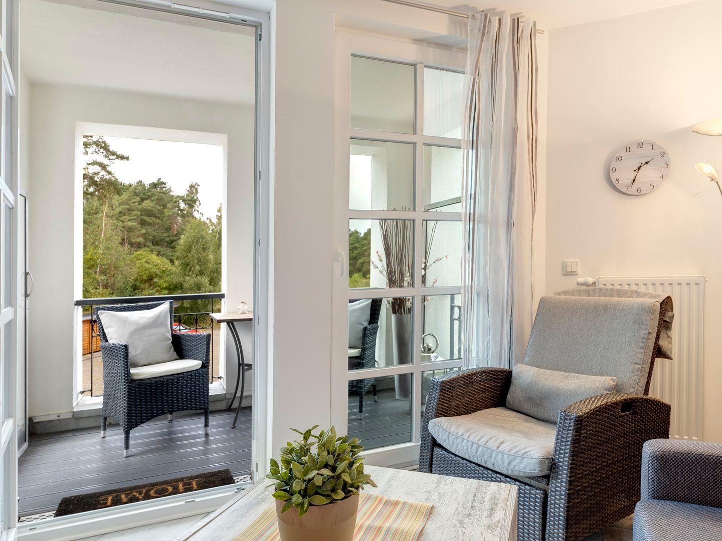 Die 2-Zimmerwohnung (41 qm) mit 4 DTV-Sternen ist ideal für 2 Personen und lädt zu erholsamen Urlaubstagen ein. Vom geschützten Balkon genießen Sie einen herrlichen Blick aufs Achterwasser und den Düker, von Mittag bis in die Abendstunden.