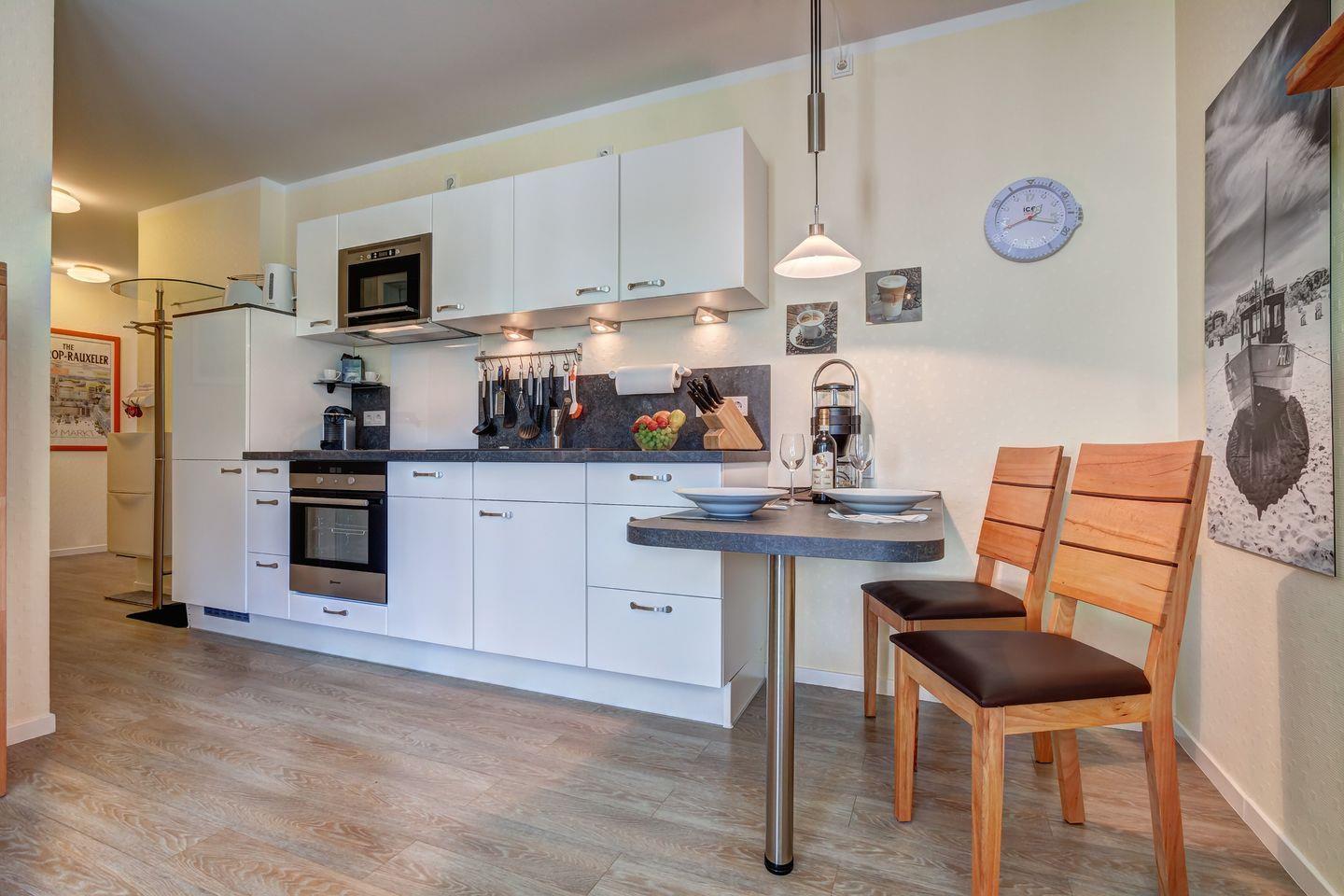Die Wohnung ist lichtdurchflutet und offen gestaltet, ideal für maximal 2 Personen, die sich hier garantiert wohlfühlen werden. Im Wohnzimmer erwartet Sie ein gemütliches Leder-Sofa, ein 37 Zoll LED Flachbildschirm SAT HD TV (3D-fähig) mit Blu-Ray DVD/CD-Player, sowie ein kleiner Erker mit einem Stressless Sessel und Blick auf den Balmer See. Der Zugang zur Süd/West ausgerichteten Terrasse mit Strandkorb, Tisch, 2 Stühlen und der beeindruckenden Aussicht auf den Balmer See (Achterwasser) bietet einen malerischen Rahmen für Ihre Erholung.