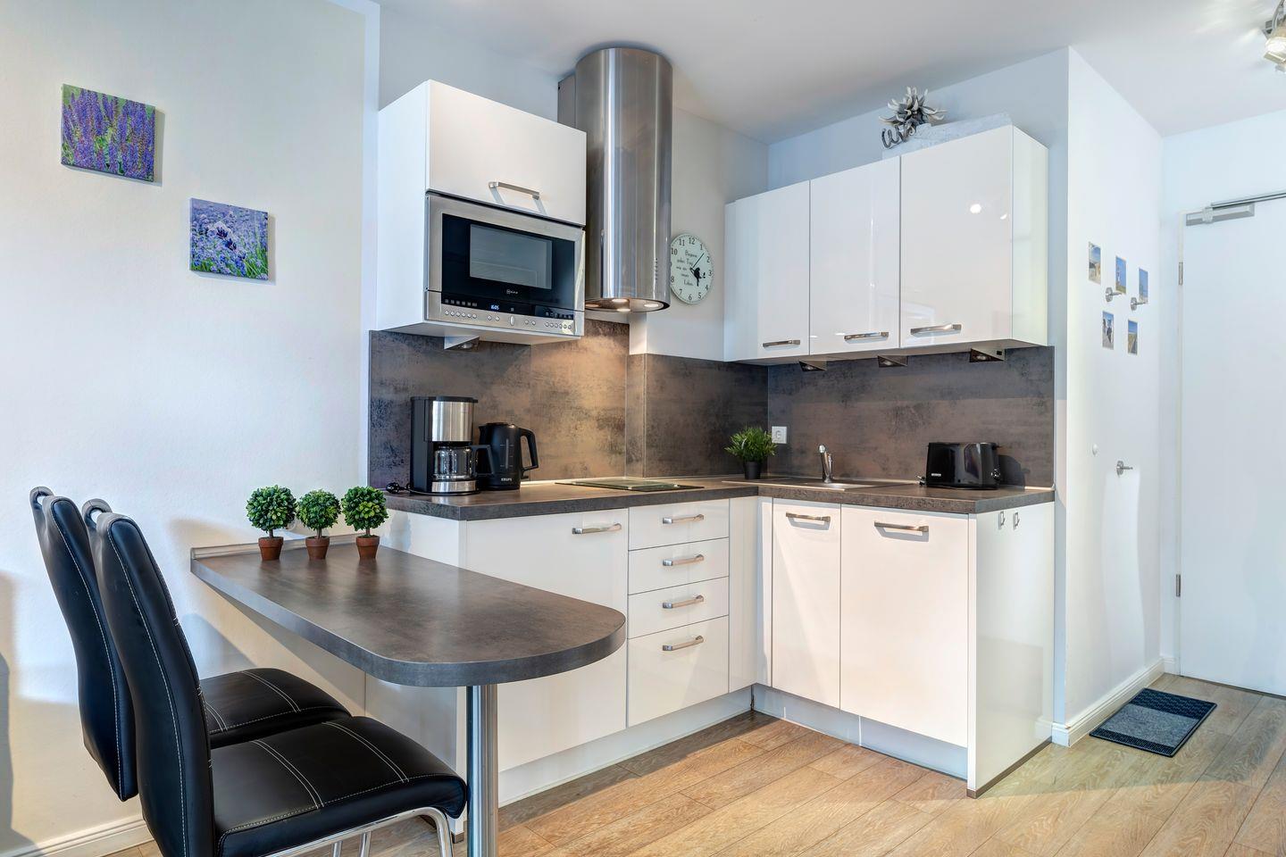 Unsere helle und freundliche Ferienwohnung bietet Platz für bis zu 2 Personen und besticht durch einen großzügigen Wohn- und Essbereich sowie ein behagliches Schlafzimmer. Die moderne und hochwertige Einbauküche lädt dazu ein, kulinarische Genüsse zu zaubern und gemütliche Abende zu verbringen.