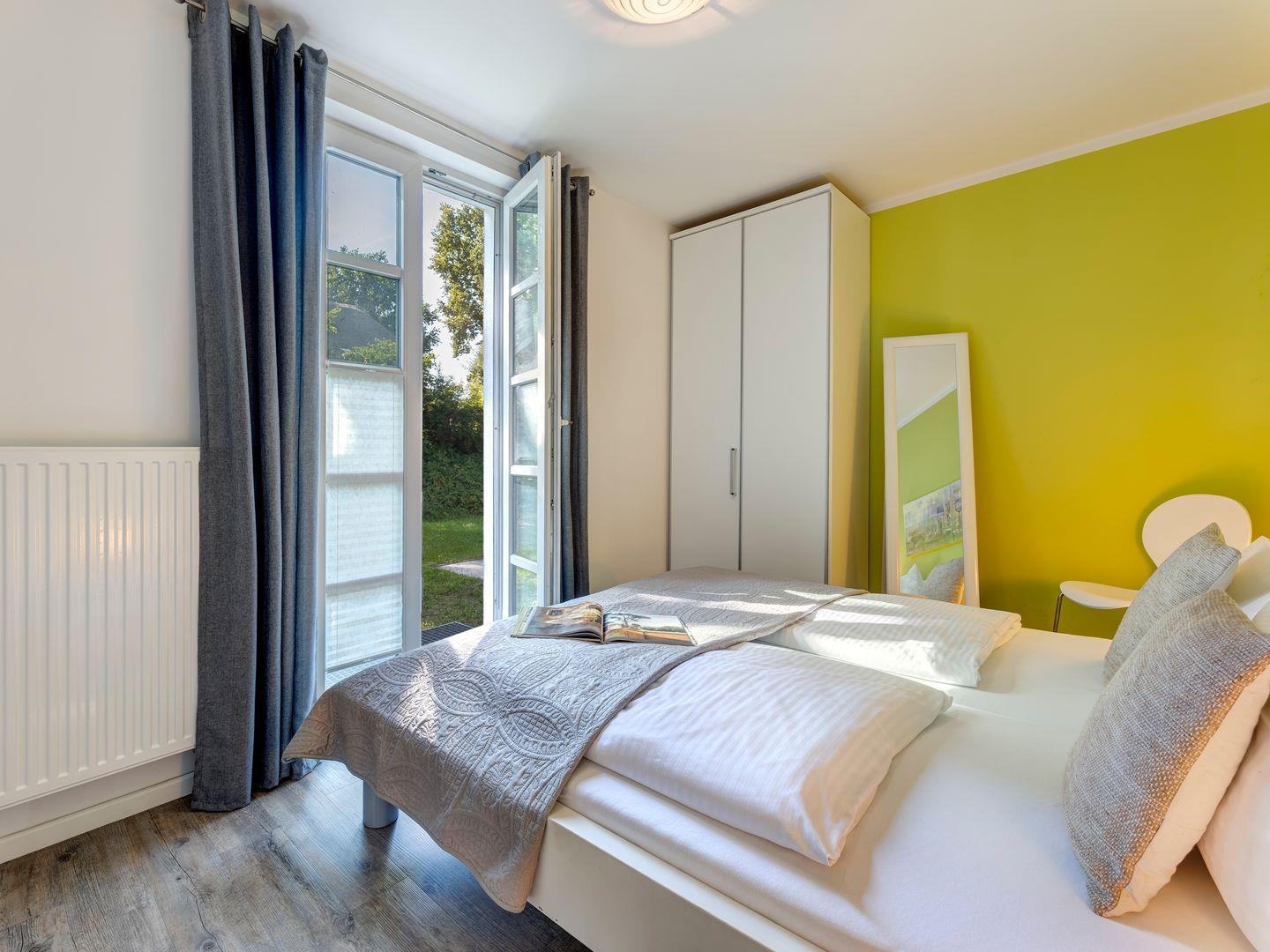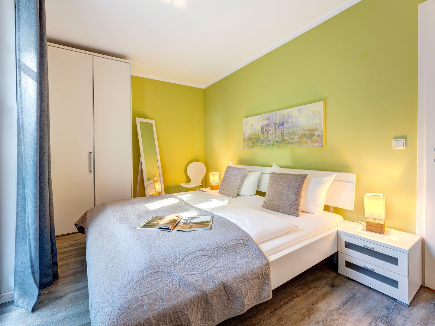 Das vollwertige Schlafzimmer mit einem gemütlichen Doppelbett sorgt für erholsame Nächte. Für Ihren Komfort sind die Betten bei Ihrer Anreise bereits bezogen, und Handtücher liegen für Sie bereit. Bei Bedarf bietet das Schlafsofa im Wohnzimmer mit Schlaffunktion Platz für zwei weitere Personen.