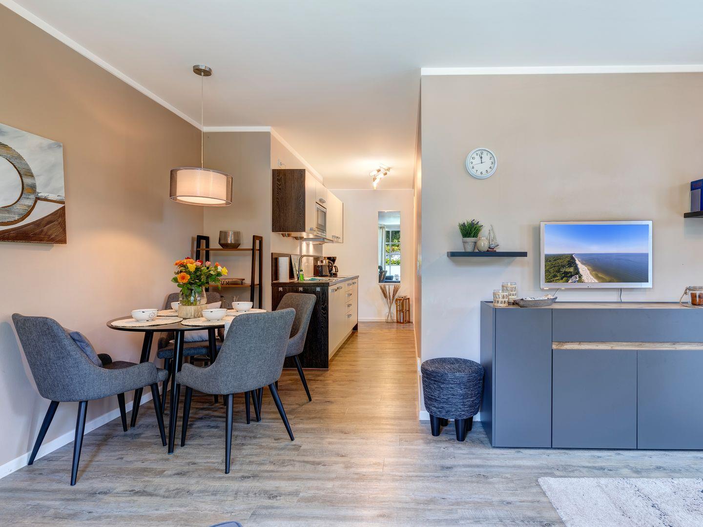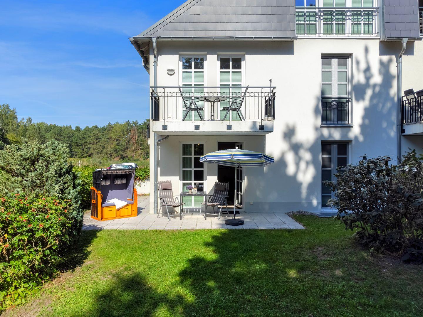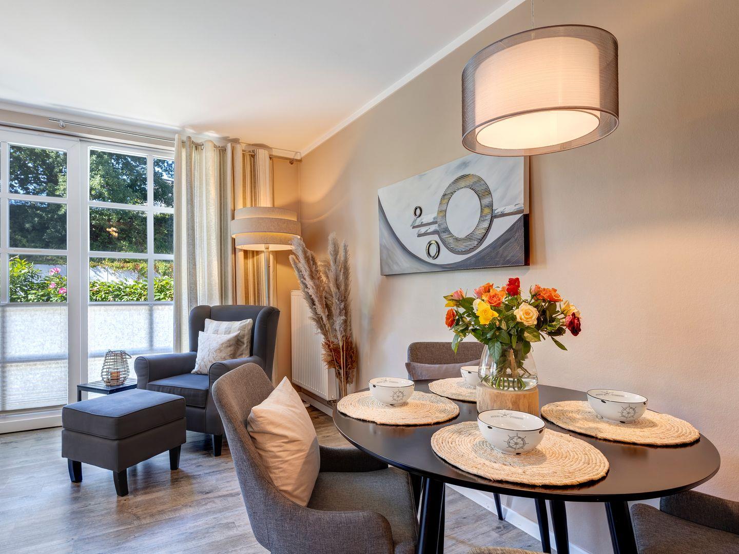 Die 47 qm große Wohnung bietet Ihnen Ruhe und Erholung in einer großzügigen, lichtdurchfluteten Wohnatmosphäre. Der großzügige Wohnbereich lädt zum Verweilen ein und öffnet sich zu einer sonnigen Terrasse. Genießen Sie Ihre Urlaubszeit geschützt unter einer Überdachung im eigenen Strandkorb an der frischen Luft. Hier können Sie die Seele baumeln lassen und die malerische Umgebung in vollen Zügen genießen.