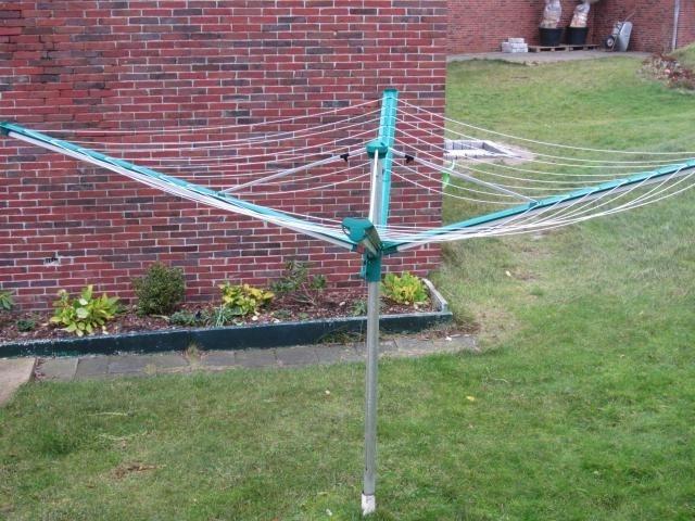 Münzwaschmaschine und Trockenplatz.