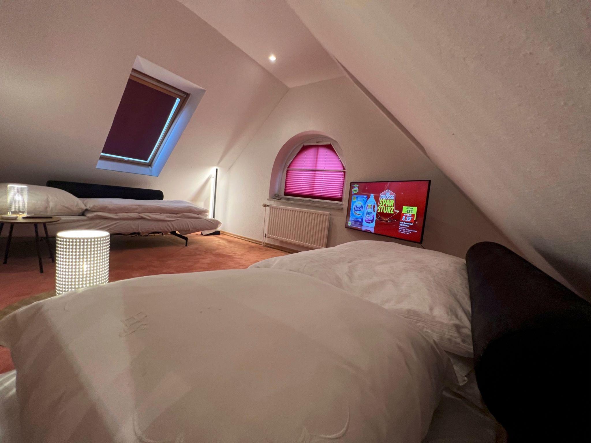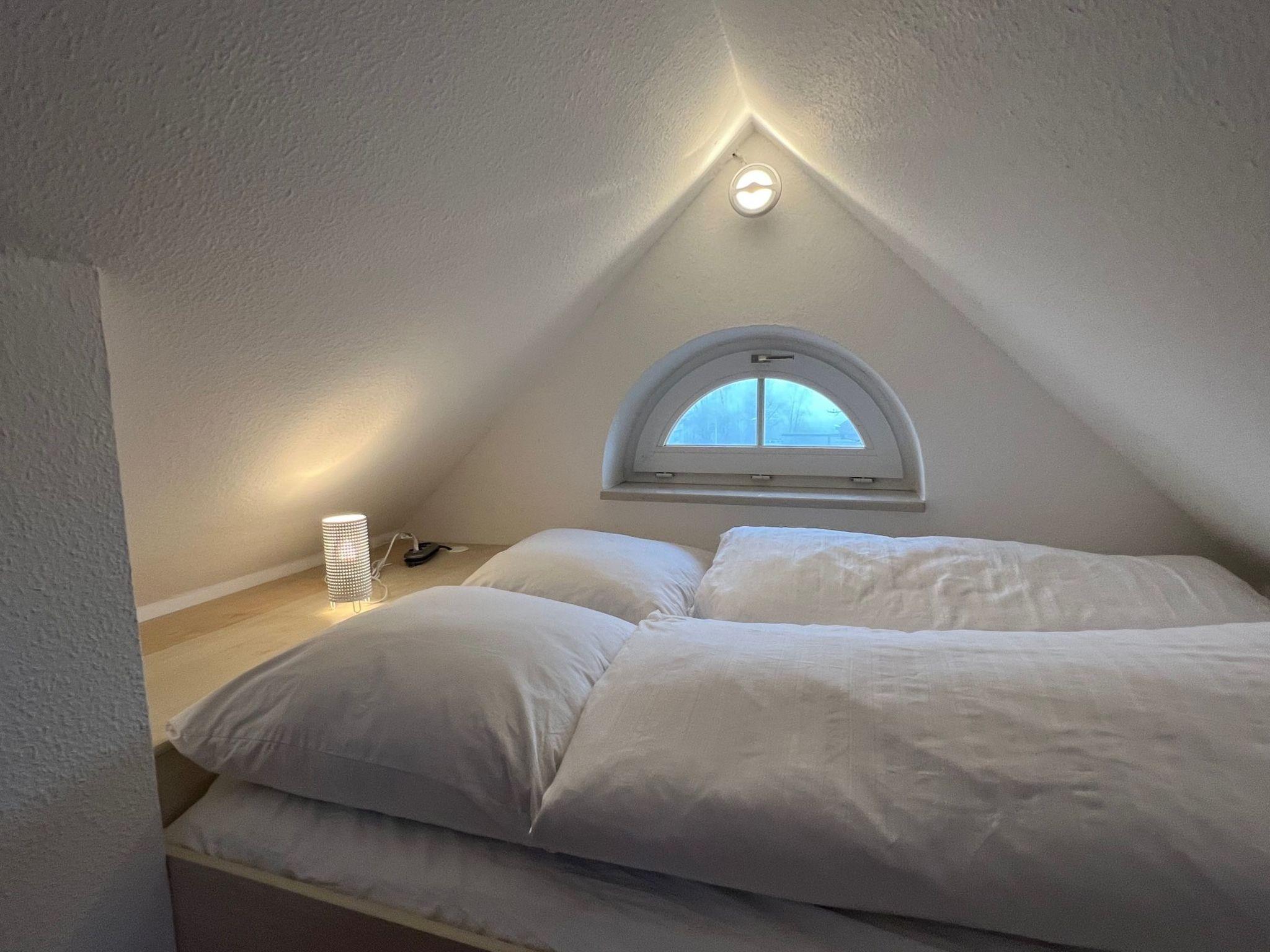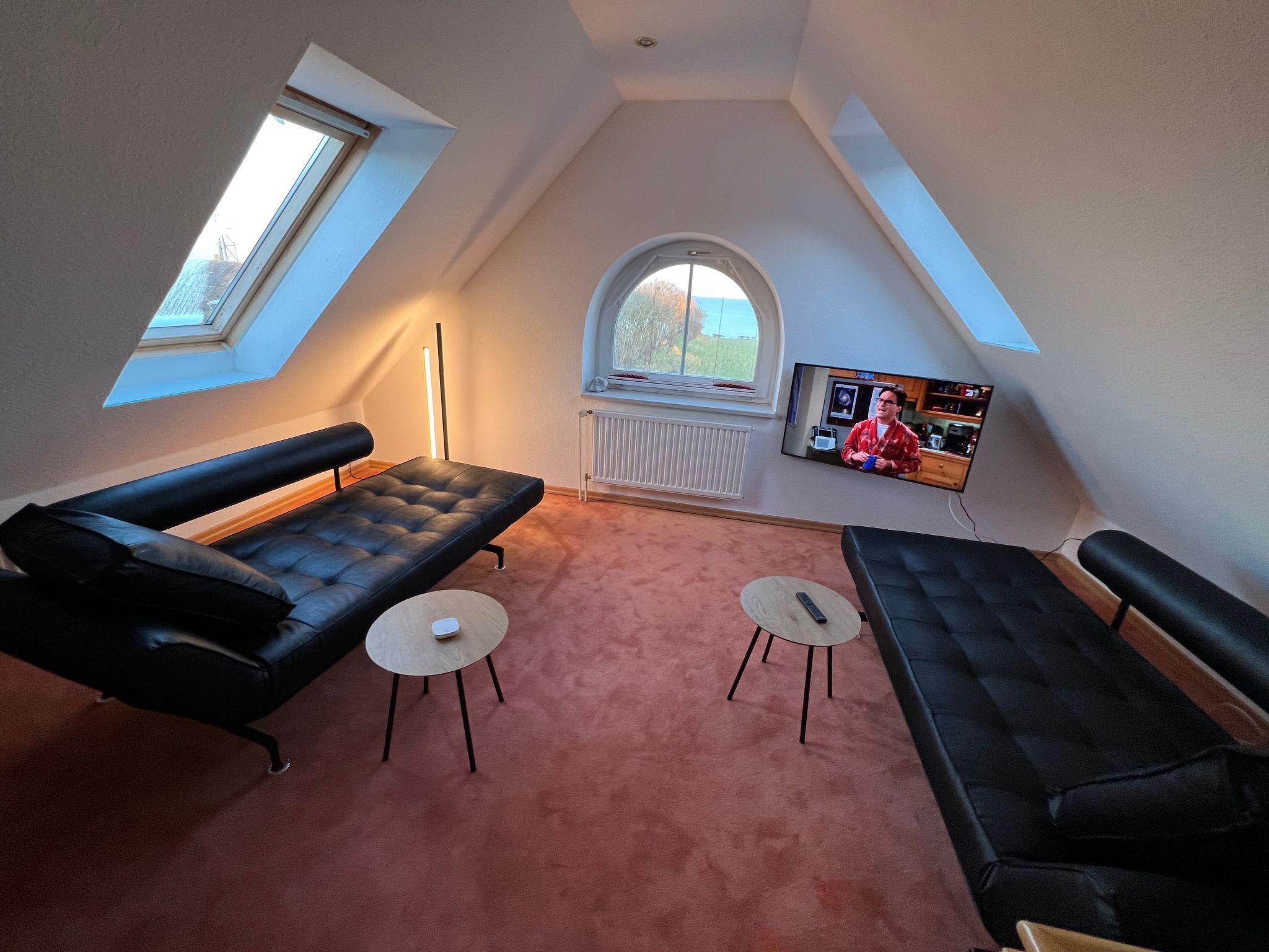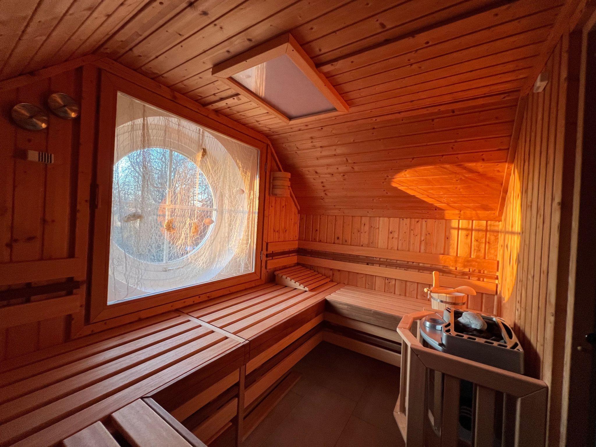 It is a maisonette flat over two floors. On the 1st floor there is a bathroom with shower and toilet, a bedroom with a 2m double bed and 50 inch Smart TV as well as an integrated wardrobe and a small desk. There is also a large living room with a large dining table, 6 chairs, sofa bed, 2 armchairs, display cabinet and 75-inch Smart TV. From the living room you can access the balcony with table and six chairs, as well as the fully equipped kitchen with four-ring hob, oven, dishwasher, washing machine and large fridge with freezer compartment and ice cube dispenser. There is a direct sea view from the living room, balcony and kitchen! A staircase leads to a further living/bedroom on the 2nd floor. This is furnished with two sofas, which can also be used as a single bed. There is also a 1.40 m double bed (please note: access to the bed with a maximum headroom of 1.70 m). A chest of drawers and a 42-inch Smart TV with satellite connection round off the offer. Here you can also enjoy the marvellous sea view. The bathroom with adjoining sauna, snail shower, bidet and toilet can be reached from the bed-sitting room.