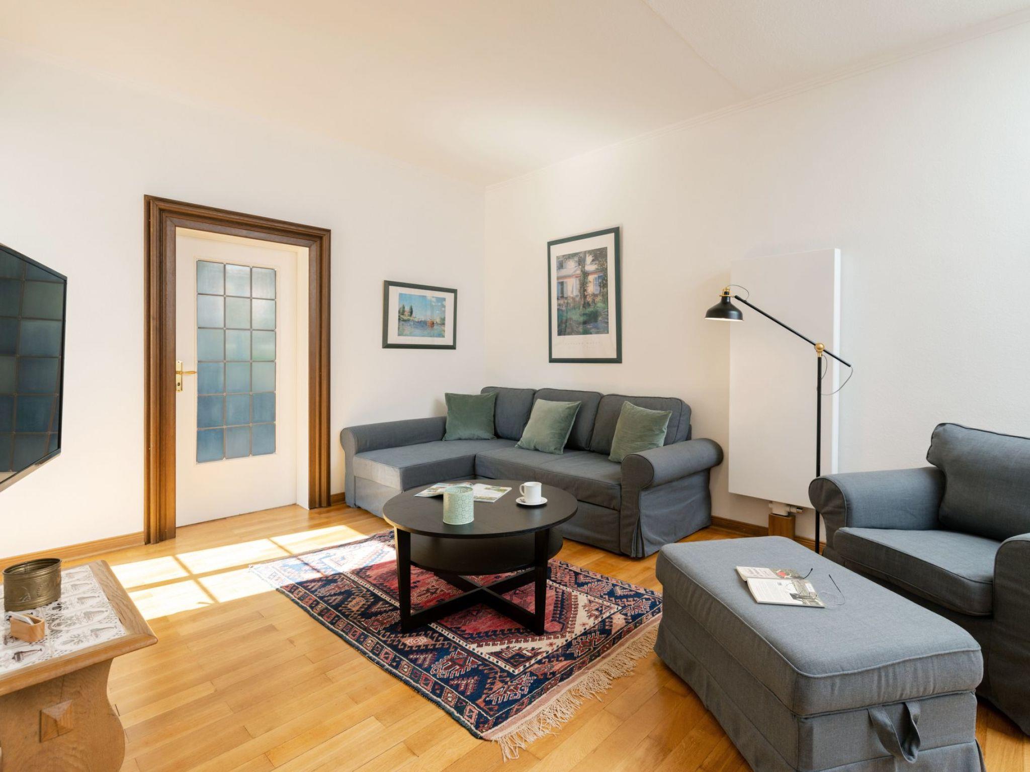The flat is characterised by well thought-out furnishings that will make your stay comfortable and pleasant. A washing machine is available for communal use in the building. In the kitchen you will find a ceramic hob, a filter coffee machine, a kettle and a dishwasher to make your everyday life easier. The fireplace provides cosy warmth and comfort on cooler days. Although the flat does not have air conditioning or underfloor heating, the use of renewable energy and solar power guarantees an environmentally conscious stay.