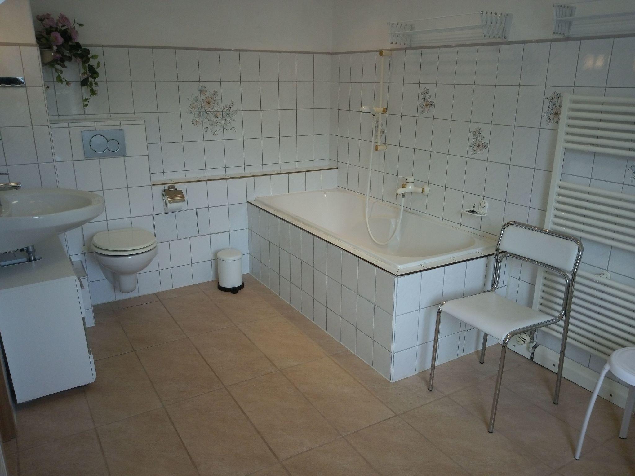 Equipment: living room: wall unit, sofa bed, extendable, table, TV each bedroom: 2 single beds, wardrobe, 2 chairs kitchen/living room: kitchenette with electric cooker, fridge, sink; dining room seating set with table, toaster, coffee machine and kettle. Bathroom: bathtub, extra shower cubicle, washbasin, WC and a second guest WC in the hallway.