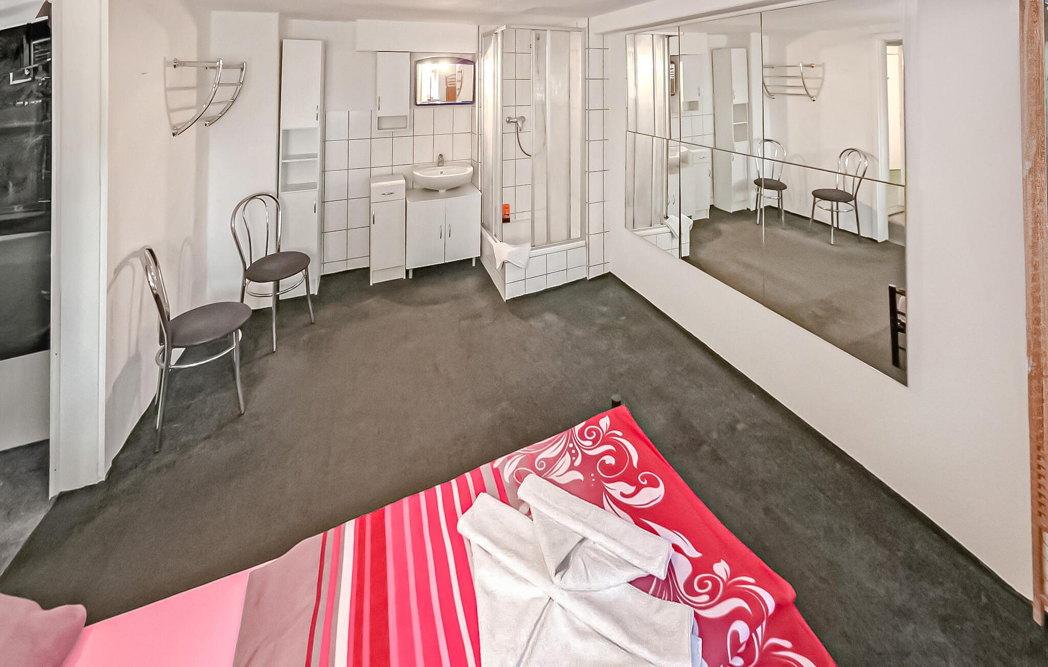 De to ferieværelser, denne 2-værelses lejlighed med integreret bruser og DZV465 med 1 dobbeltværelse med integreret brusebad, ligger i kælderen i ejerens hus, ca 1 km fra Østersøstranden. Separat adgang via en stejl trappe. Toilettet (fælles brug) og et lille værelse med diverse køkkenmaskiner (køleskab, el-komfur mv.) er rumligt adskilt fra ferieværelserne og kan nås via fælles gang. Der er en møbleret terrasse med grill, opbevaring af cykler og en parkeringsplads. Den samlede pris inkluderer sengelinned, håndklæder, vand- og energiforbrug samt slutrengøring. Betales på stedet: turistskat, WiFi 5 EUR. Overordnet set er boligen en simpel overnatning til korte ophold. Høje komfortstandarder er ikke opfyldt. Grundet fælles brug af toilet og madlavningsfaciliteter anbefales det at booke begge værelser helt. Badebyerne Bansin, Heringsdorf og Ahlbeck er de såkaldte kejserlige feriesteder på øen Usedom. De har brede sandstrande, moler med moler og er forbundet med hinanden af en promenade, der fører til Swinoujscie i Polen. I byerne er der leje af cykler, båd og strandstole, tennisbaner og et netværk af godt afmærkede vandrestier. Et moderne vandland, "Ostseetherme", ligger centralt mellem Heringsdorf og Ahlbeck. Grænseovergangen til Polen kan nås fra Ahlbeck på få minutter.