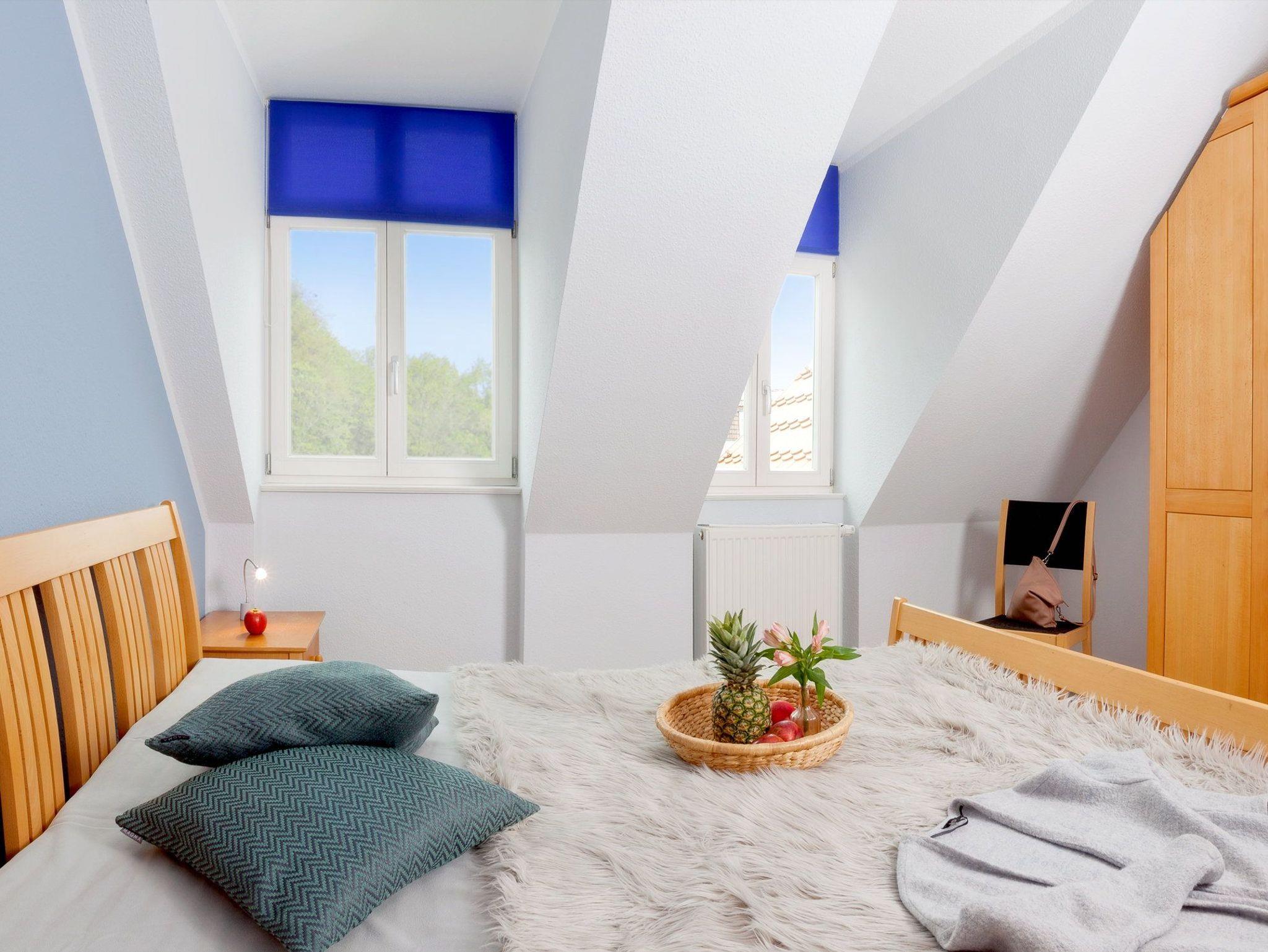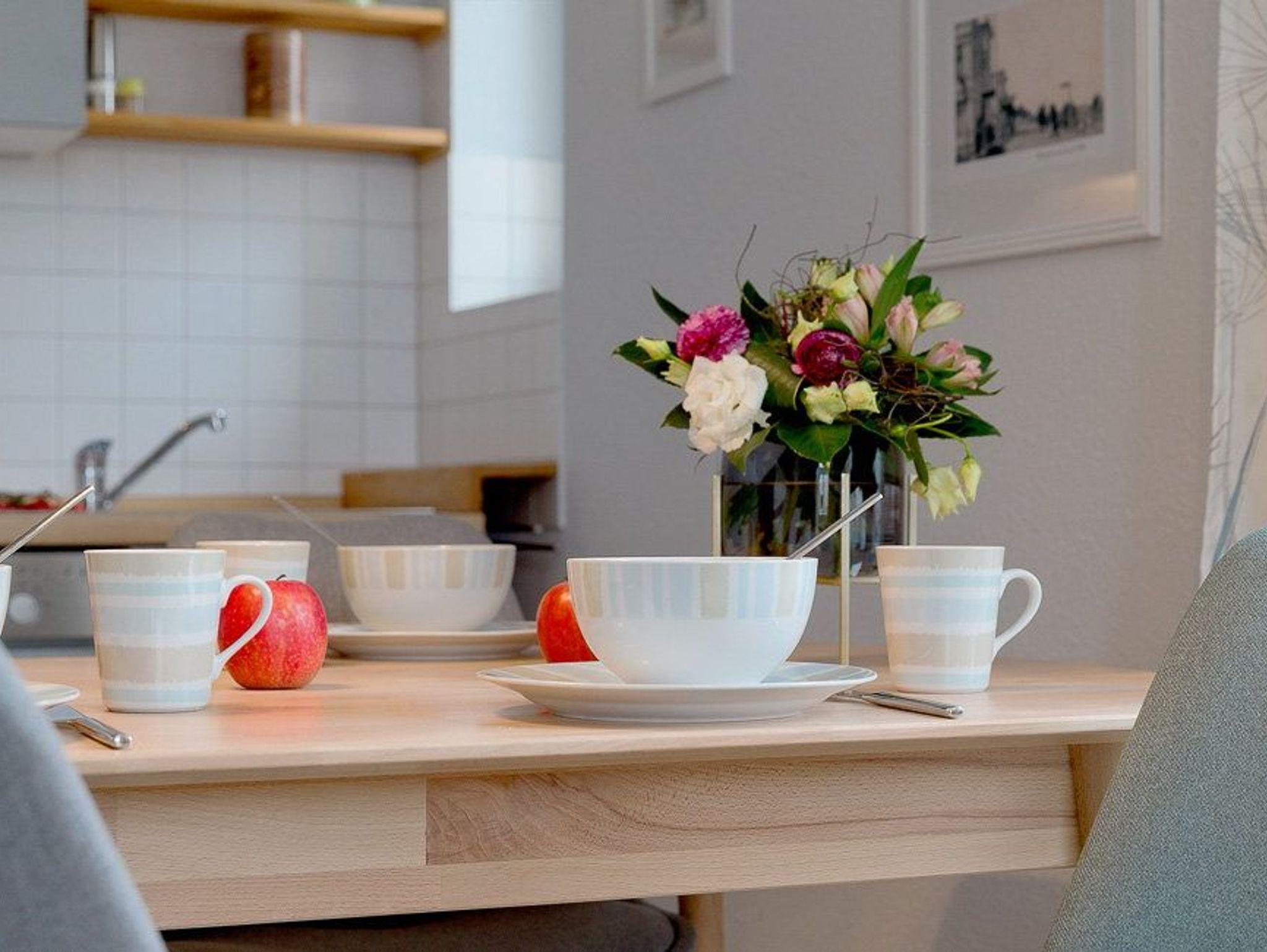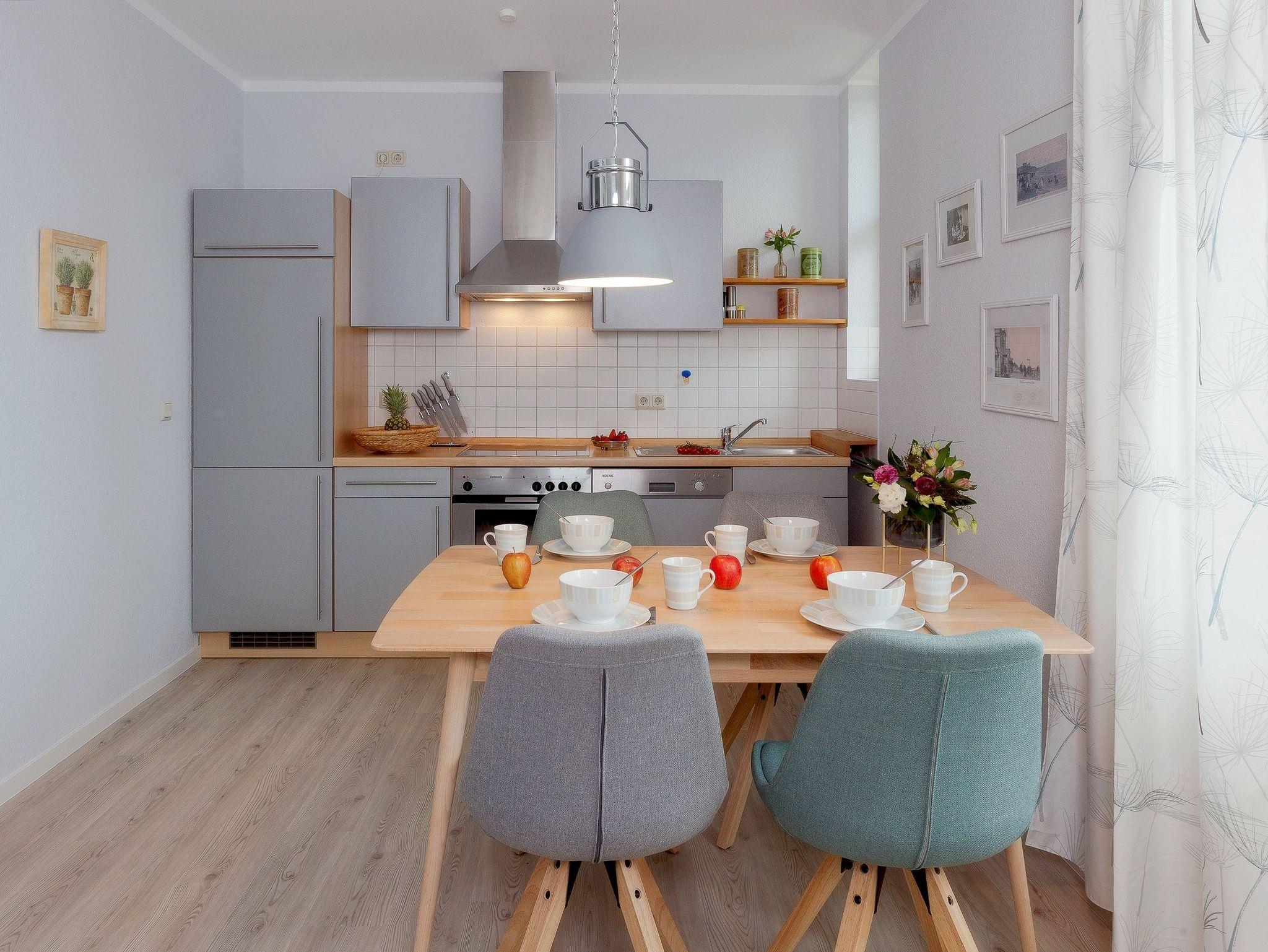 Kostenfreier WLAN-Zugang, ein Fahrradabstellraum sowie ein Stellplatz direkt hinter dem Haus runden die Annehmlichkeiten dieses Appartements ab. Waschmaschine und Trockner können gern gegen Gebühr genutzt werden. Helle Wände, ein heller warmer Fußboden in Holzoptik wird sich mit Naturholzmöbeln paart sich mit nordischem Design. Das Appartement liegt sehr ruhig auf der Rückseite der Villa. Vom Balkon aus hat man einen verlockenden Blick in den Buchenpark und zugleich kann man die Ostsee zwischen den Häusern erblicken.