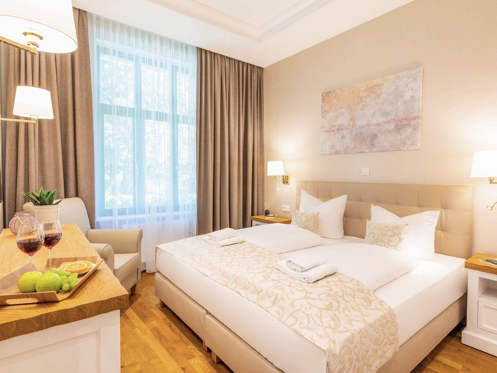 Die voll ausgestattete Küche, maßgefertigt von einem einheimischen Tischler, lässt keine Wünsche offen: Backofen, Mikrowelle, Kühlschrank mit Gefrierfach, Toaster, Wasserkocher und Kaffeemaschine sowie ein Essbereich für vier Personen mit Blick in den gegenüberliegenden Park machen gemeinsame Mahlzeiten zum Genuss. Echtholzparkett im Wohn- und Schlafbereich, langlebige Designer-Tapeten aus den USA und liebevolle Details unterstreichen den exklusiven Charakter des Appartements.