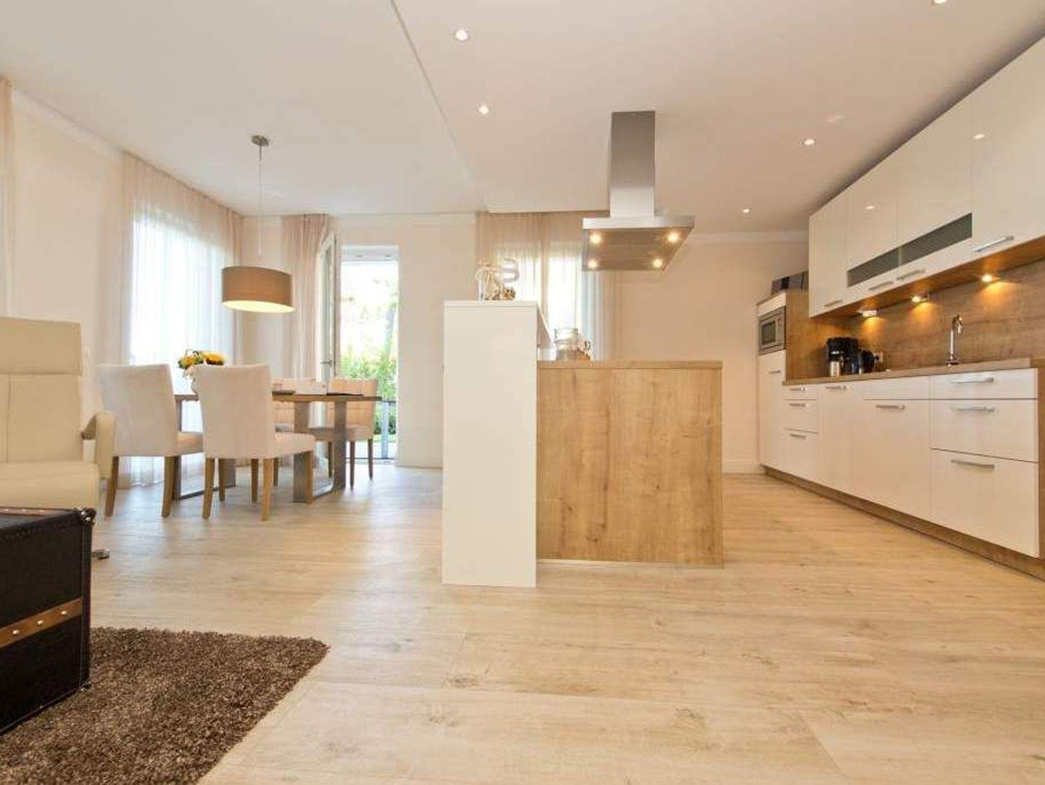 Lässige Eleganz und das Meer zum Greifen nahe! Nur wenige Schritte über die Promenade und schon stehen Sie direkt am Strand! Aus der Wohnung haben Sie einen schönen Blick auf die Ostsee. Die großzügige 120 qm, 3-Raum-Ferienwohnung bietet Platz für 4 Personen und 2 Kleinkinder (bis 3 Jahre im Babyreisebett). Es befindet sich im Erdgeschoss (auf der Düne) und ist mit allem Komfort ausgestattet. Versierte Innenarchitekten haben hier ein charmantes Urlaubsziel geschaffen. Der Wohnbereich mit großer Fensterfront zum Meer und bequemer Sitzgruppe vor dem Kamin wird ergänzt durch die exklusive offene Küche mit großem Essplatz. 2 Schlafzimmer mit Boxspring-Doppelbetten und jeweils eigenem TV bieten besten Schlafkomfort. Das erste Bad verfügt über eine Badewanne, Dusche und WC. Im zweiten Bad mit großer Glasdusche wurde die wohnungseigene Sauna integriert, ein Highlight, nicht nur in der kalten Jahreszeit. Zusätzlich gibt es noch ein Gäste-WC. Zum Lieblingsplatz werden sicher schnell die Terrasse mit eigenem Strandkorb und auch der seitliche Balkon. Auf beiden lässt es sich ganz entspannt relaxen! Für Ihren Komfort können Sie eine Waschmaschine und den Trockner nutzen, weiterhin sind die Betten bei Ihrer Anreise bezogen und Handtücher liegen bereit (Erstausstattung). Babyreisebett und Hochstuhl können auf Wunsch (gegen Aufpreis) dazu gebucht werden. Für Ihren PKW stehen Ihnen 2 separate Stellplätze zur Verfügung.
