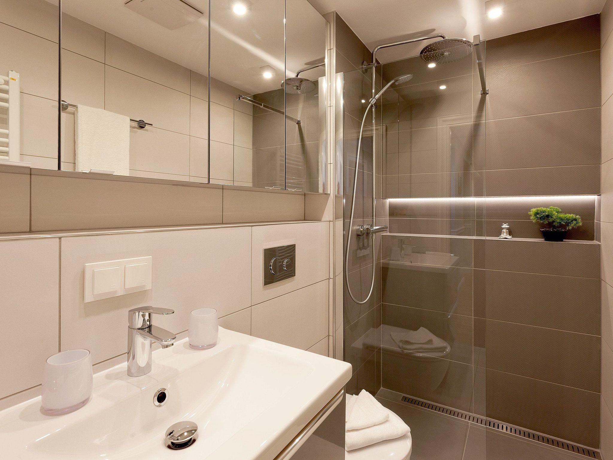 Die zwei modernen Badezimmer lassen keine Wünsche offen: Das Hauptbad überzeugt mit großformatigen dunklen Natursteinfliesen, heller Badkeramik und Armaturen in Messing, ergänzt durch eine komfortable Duschwanne. Das zweite Bad en Suite, direkt vom zweiten Schlafzimmer begehbar, verfügt über eine bodengleiche Dusche, WC und Haartrockner so beginnt jeder Tag entspannt und komfortabel.