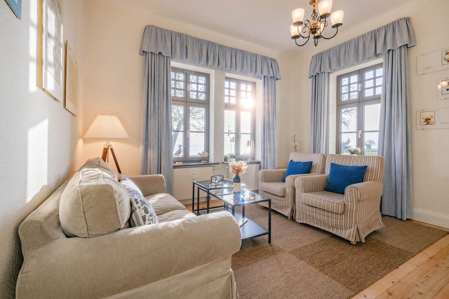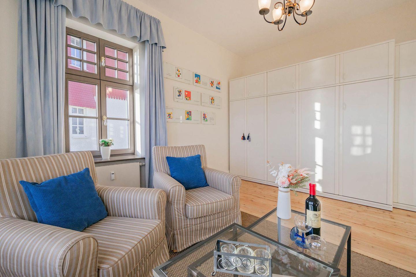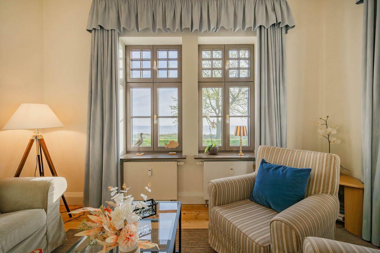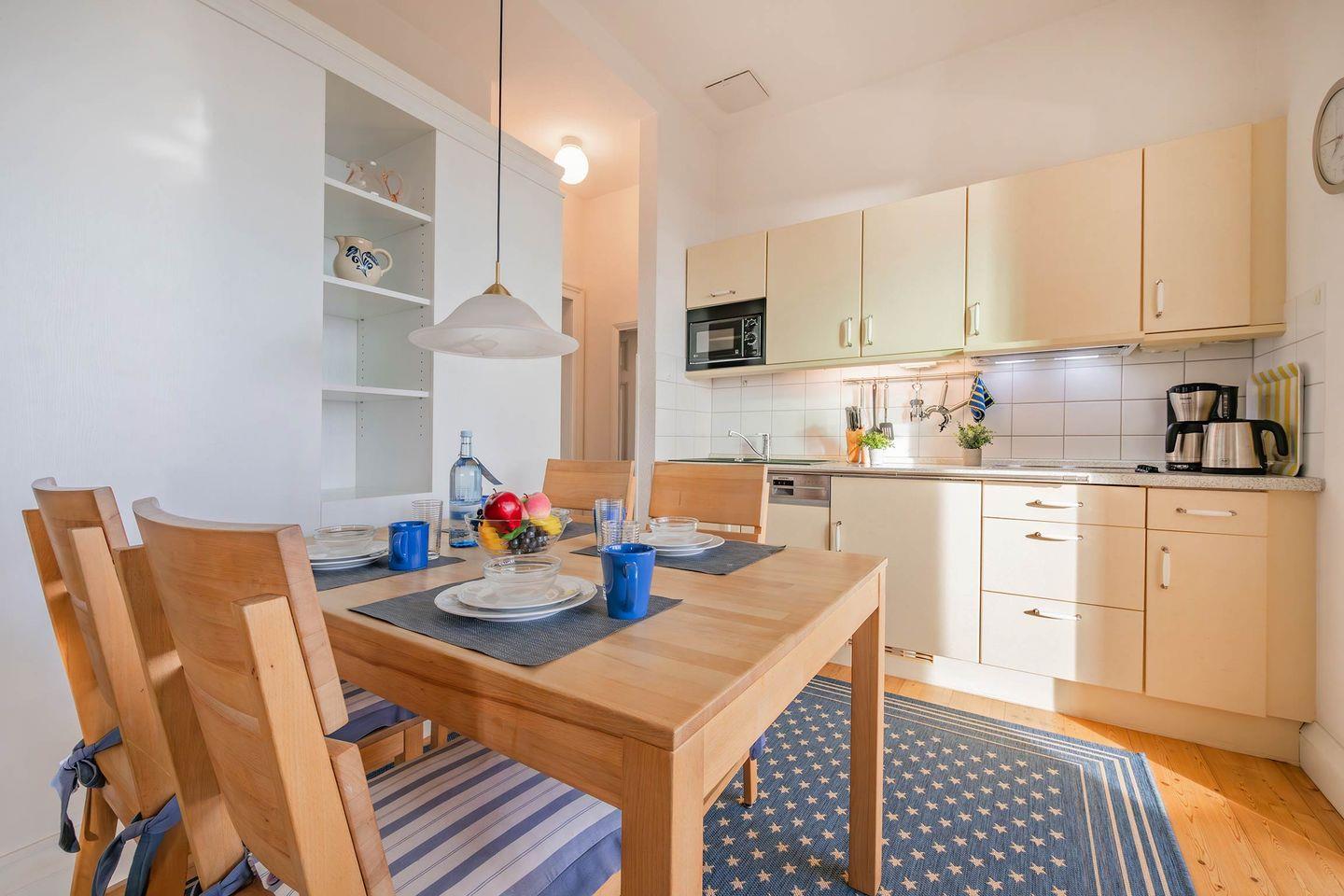 Im Hochparterre des Hauses befindet sich die geräumige Drei-Raum-Wohnung. Auf 62 Quadratmetern werden Sie eine liebevolle Zusammenstellung aus warmen Farben und maritimen Aktzenten vorfinden. Bis zu vier Personen können hier erholsam urlauben. Die helle Loggia ermöglicht - dank bequemer Sessel und einem Fernseher - eine Auszeit bei fantastischem Meerblick. Erleben Sie zahlreiche Sonnenstunden auf der Terrasse bei gesunder Meeresluft und beobachten das Treiben auf der anliegenden Strandpromenade. Mit der ganzen Familie lässt es sich wunderbar am großen Esstisch dinieren. Die offene Küchenzeile beinhaltet eine vielversprechende Grundausstattung. So werden Sie alltagsrelevante Haushaltsgeräte wie einen Herd mit 4-Platten, eine Mikrowelle, Kühlschrank und einen Geschirrspüler vorfinden.