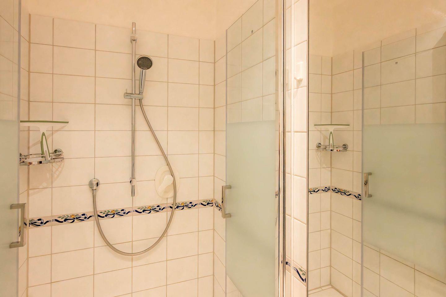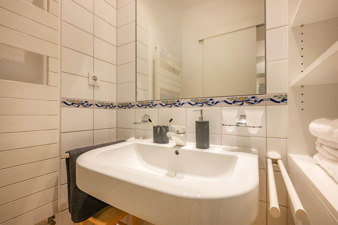 Das Bad ist mit einem Waschbecken, WC einer Dusche und einer Handtuchheizung ausgestattet.