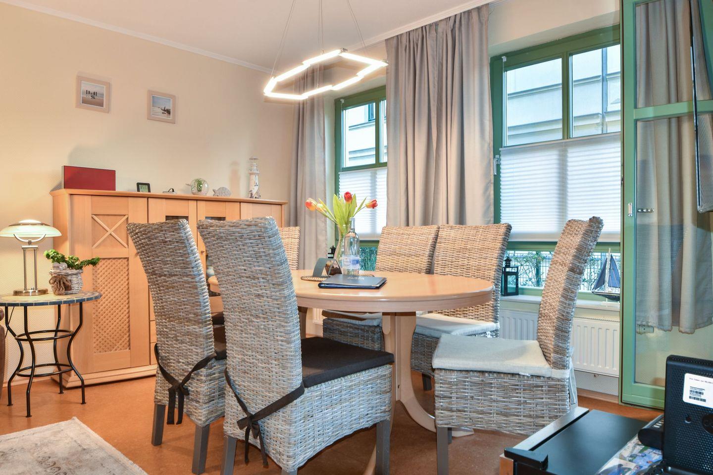 In dem modern und hochwertig ausgestatteten 3-Raum-Appartement im Erdgeschoss der Villa Goethe können bis zu fünf Personen auf 68 Quadratmetern einen erholsamen Urlaub verbringen. Der offene Wohn- und Essbereich ist modern und gleichzeitig gemütlich eingerichtet. Zur Unterhaltung steht eine Stereoanlage, ein CD-Player sowie ein Flat-TV bereit. An dem großzügigen Esstisch können Sie sich zu den Mahlzeiten zusammenfinden oder den Abend bei gemeinsamen Gesprächen oder beim Schreiben der Urlaubspost Revue passieren lassen.