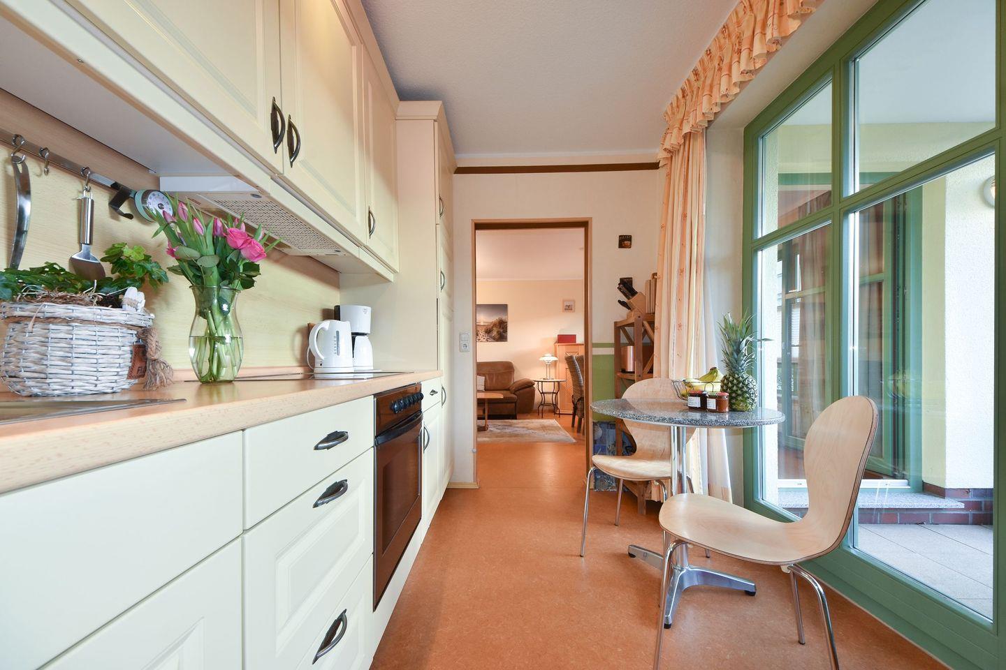 Vom Wohnbereich sowie von der Küche gelangen Sie auf Ihre private und überdachte Terrasse mit Südwestausrichtung - dank des kleinen Gartenanteils empfiehlt sich dieses Appartement ideal für Familien. Auf der Terrasse können Sie sich dem Sonnenbaden hingeben oder den Abend bei einem Gläschen Wein ausklingen lassen. Die separate Küche bietet jeglichen Komfort (Backofen, Ceranfeld, Geschirrspüler, Kühlschrank mit Gefrierfach, Senseo-Padmaschine und Kaffeemaschine, Wasserkocher, Toaster), den Sie sich von einer Küche wünschen. Für die geruhsamen Stunden während Ihres Urlaubes laden die beiden Schlafzimmer des Appartements ein. Das erste Schlafzimmer mit einem bequemen Doppelbett (180x200cm) – sowie das zweite Schlafzimmer mit zwei Einzelbetten (je 90x200cm) und einem Flat-TV. Die Schlafcouch im Wohnbereich bietet Platz für die fünfte Person.