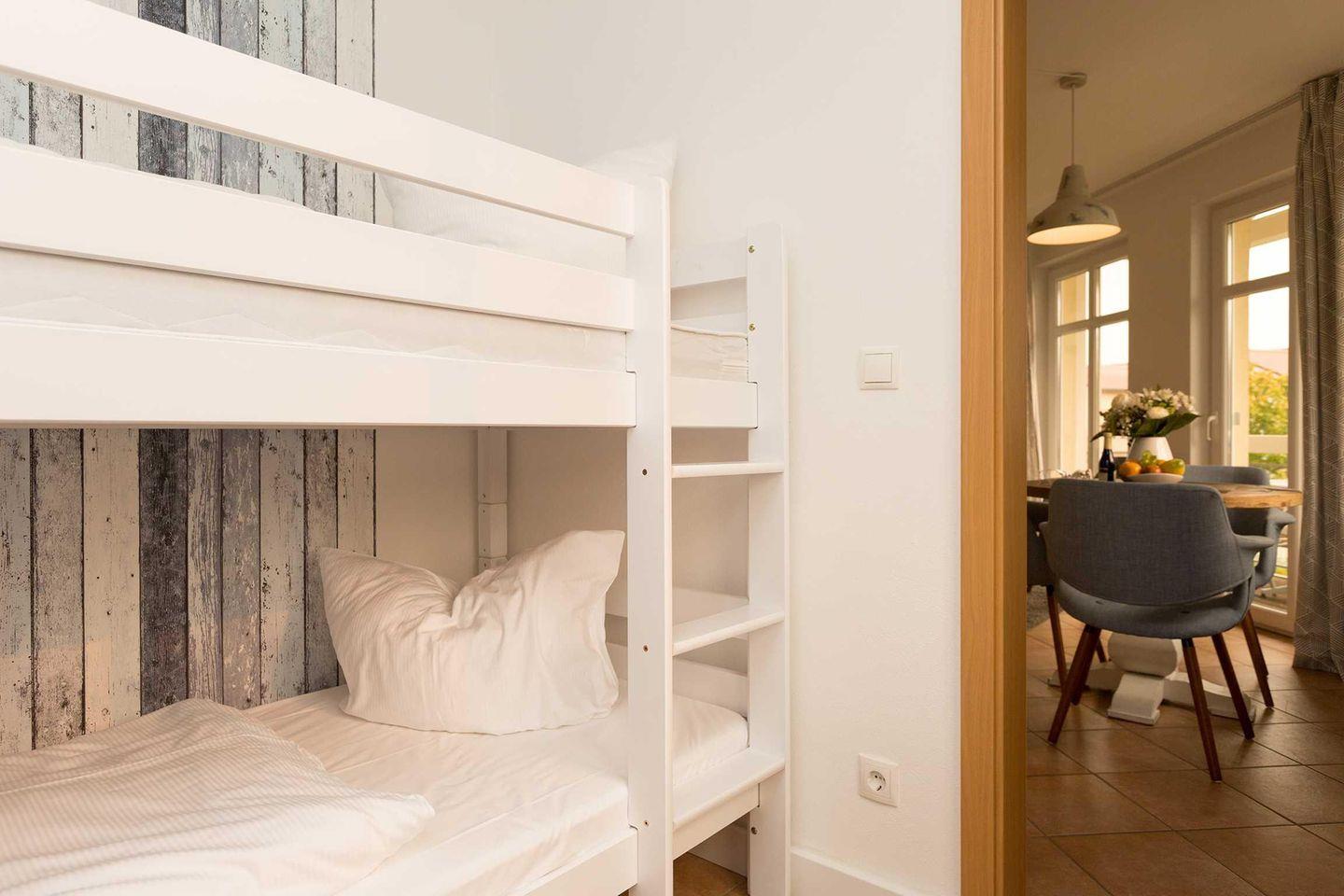 Die moderne Ferienwohnung befindet sich im 2. Geschoss des Hauses. Neu renoviert lassen die hochwertige Möblierung und die liebevollen Dekorationen lassen keine Wünsche übrig. Der Wohnbereich ist offen gestaltet und verfügt über eine vollständig ausgestattete Küchenzeile, einen Essplatz sowie eine gemütliche Sitzecke. Das größere Schlafzimmer ist mit einem Doppelbett eingerichtet, das Gästezimmer mit einem Etagenbett - ideal für Kinder. Ein Duschbad rundet das Angebot ab. Vom Wohnraum haben Sie Zugang zum Balkon. Für unsere kleinen Gäste stehen ein Baby-Reisebett mit Matratze (ohne Wäsche) und ein Kinderhochstuhl zur Verfügung.