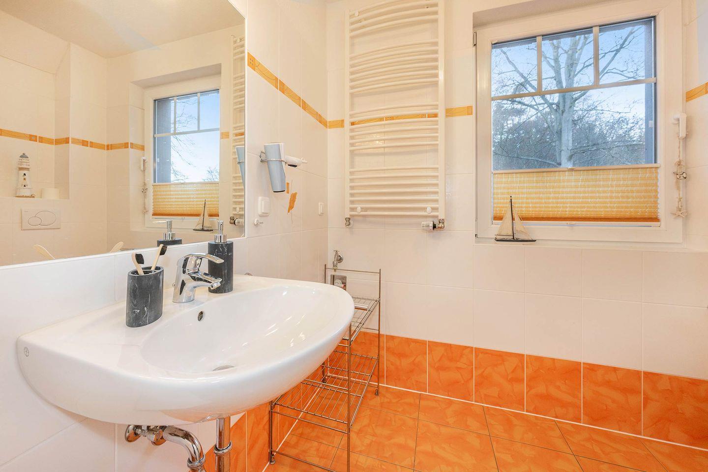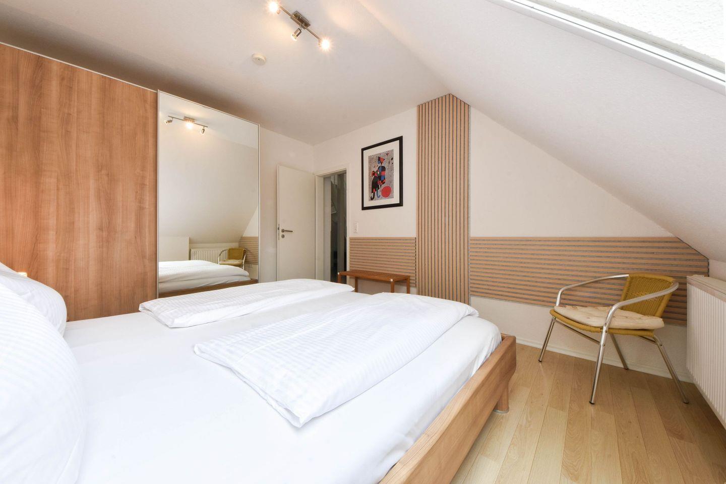 Das Raumkonzept der Wohnung ist ideal für Familien oder Paare, die Wert auf getrennte Schlafbereiche legen. Das Hauptschlafzimmer ist eine wahre Oase der Ruhe und verfügt über ein besonders großes Doppelbett mit einer komfortablen Liegefläche von 2,00m x 2,00m. Ein geräumiger Kleiderschrank und eine effektive Verdunklungsmöglichkeit garantieren hier erholsame Nächte. Eine architektonische Besonderheit ist das zweite Schlafzimmer: Über eine Treppe im Wohnraum erreichen Sie die gemütliche obere Ebene, wo eine bequeme Schlafcouch als Rückzugsort dient – ideal für Kinder oder weitere Mitreisende. Das moderne, vollwertige Bad lässt mit einem Fenster für Tageslicht und einer komfortablen bodengleichen Dusche keine Wünsche offen.