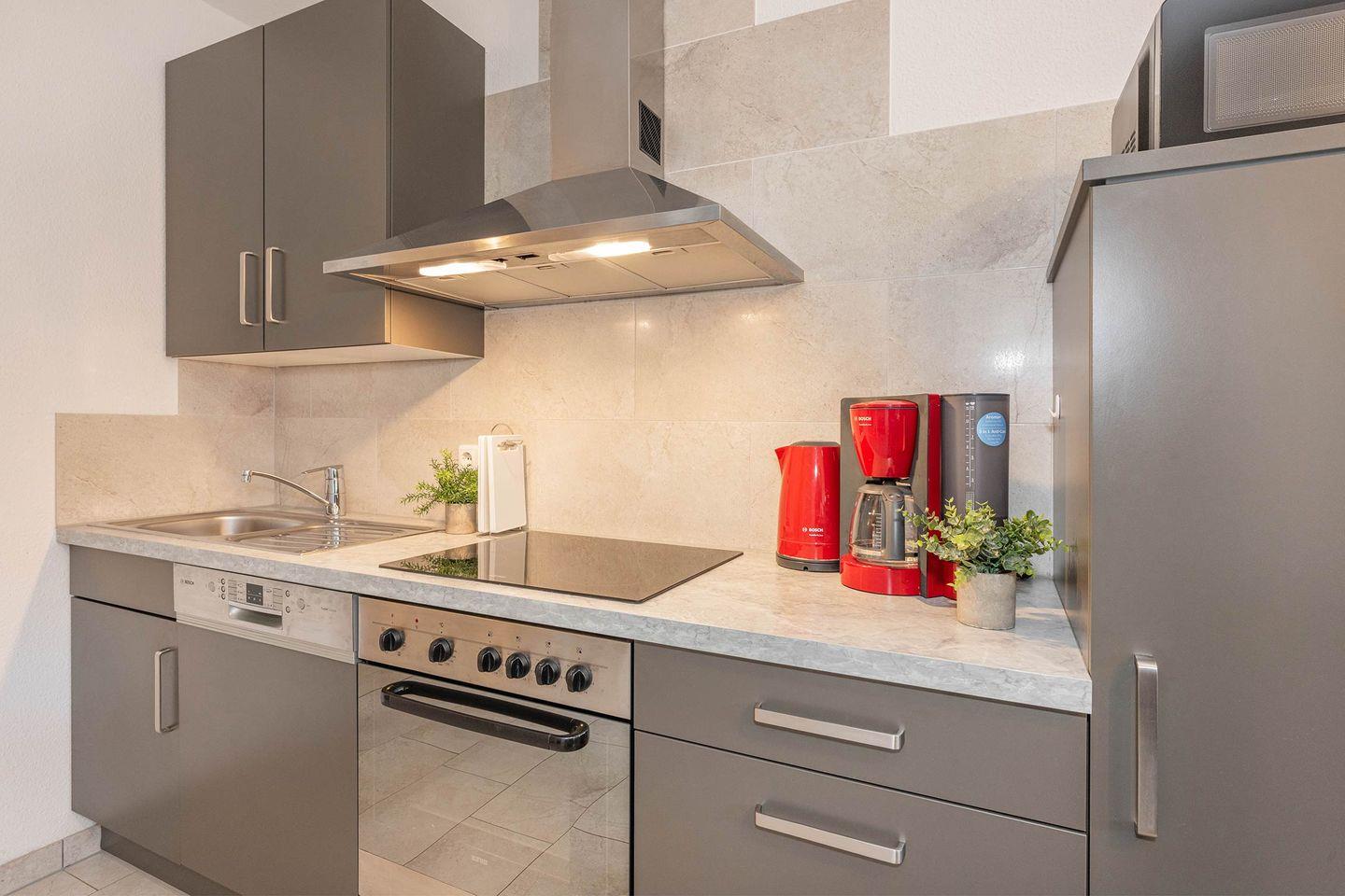 Der Innenbereich der Wohnung überzeugt durch einen stimmigen und hochwertigen Einrichtungsstil, der sofort für Wohlbefinden sorgt. Das Herzstück bildet der lichtdurchflutete Wohnraum, in den eine moderne, offene Küche harmonisch integriert ist. Hier finden Hobbyköche alles, was das Herz begehrt, inklusive Spülmaschine und Ceranherd, um kulinarische Köstlichkeiten zu zaubern. Ein gemütlicher Esstisch lädt zu gemeinsamen Frühstücken oder Abendessen ein, während der Wohnbereich mit einem Flat-TV für entspannte Unterhaltung sorgt. Vom Wohnzimmer aus gelangen Sie auf den Balkon, der mit bequemer Bestuhlung ausgestattet ist. Hier können Sie den idyllischen Ausblick in die begrünte Umgebung genießen, dem Gesang der Vögel lauschen und den Alltag weit hinter sich lassen.