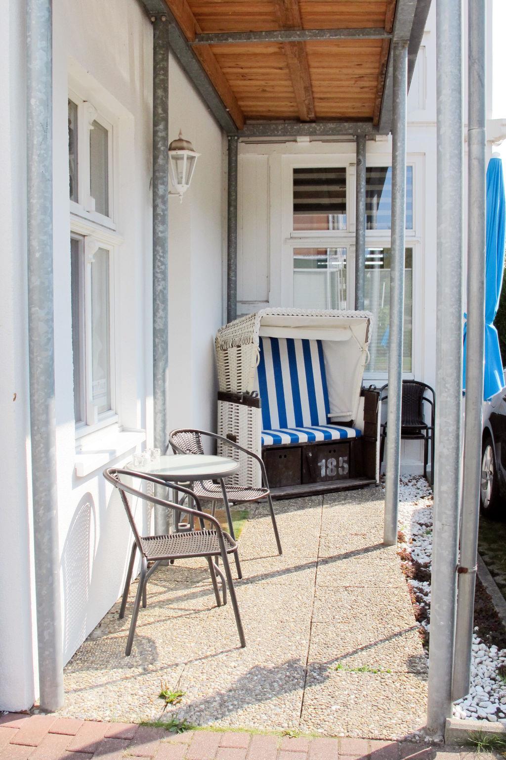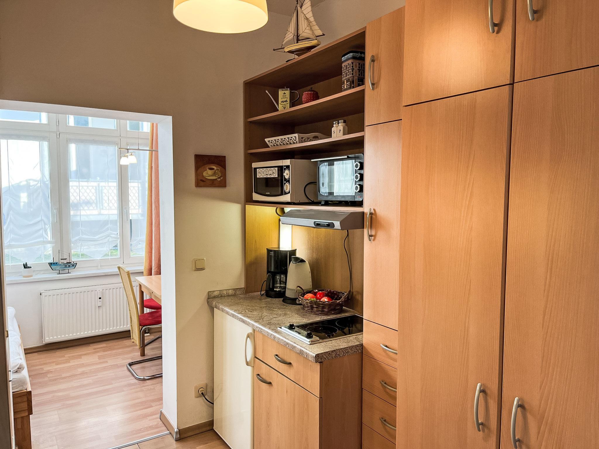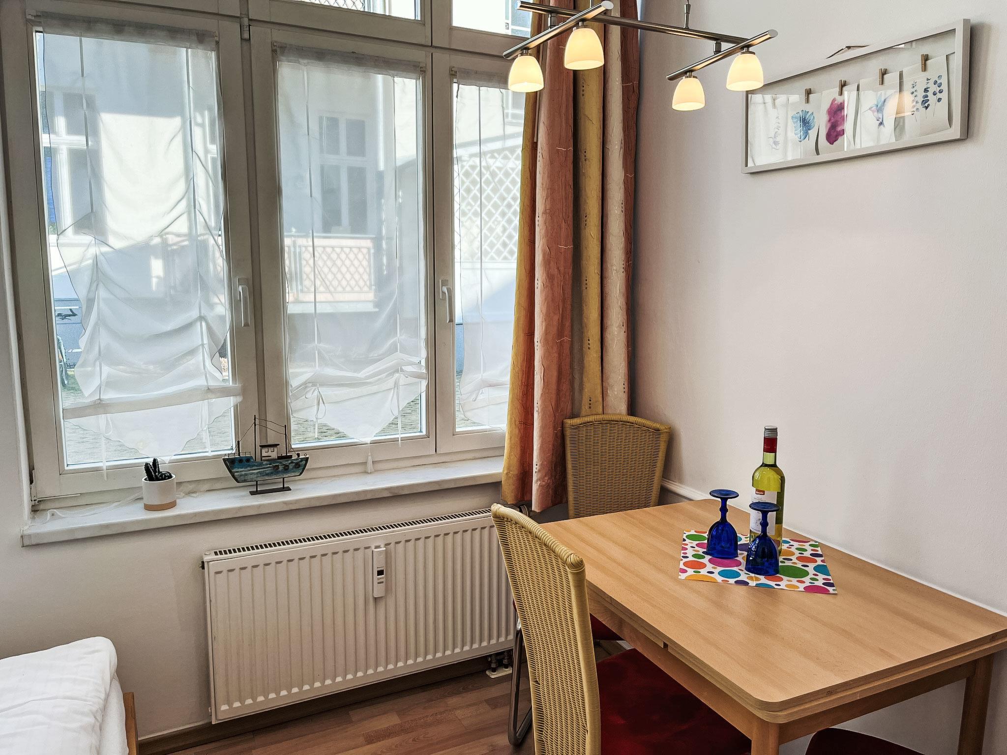 "Bergstraße", 1-room apartment 32 m2, on the ground floor. Bright, renovated in 2022, modern and cosy furnishings: living room with satellite TV, radio and DVD. Exit to the terrace. 1 open small room with 1 double bed (2 x 80 cm, length 200 cm). Open kitchen (mini-oven, dishwasher, 2 ceramic glass hob hotplates, toaster, kettle, microwave, electric coffee machine) with dining table. Shower/WC. Heating. Terrace partly roofed. Terrace furniture. Facilities: children's high chair, baby cot. Internet (WiFi, free). Parking (1 car). Please note: non-smokers only. Maximum 2 pets/ dogs allowed. Smoke alarm.