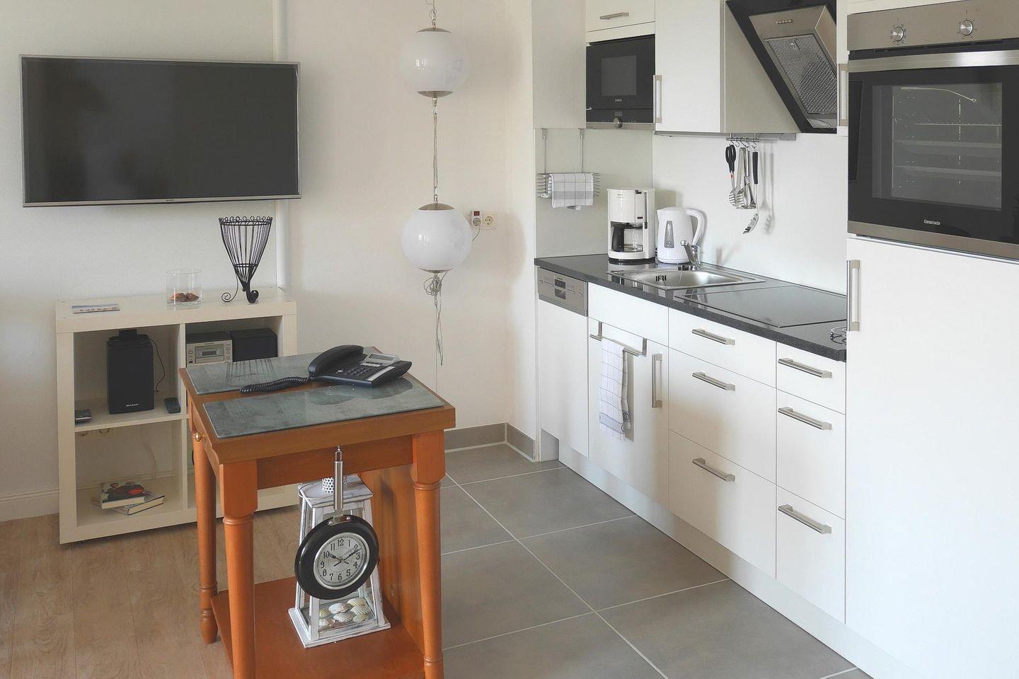 Das Apartment verfügt über kostenfreies WLAN und eine voll ausgestattete offene Küche mit Wasserkocher, Kaffeemaschine, Toaster, Ceranherd, Backofen, Geschirrspüler, Mikrowelle und Tiefkühlfach. Ein Wohnbereich mit HiFi-Anlage und Flachbild-TV vervollständigen die Ausstattung des Apartments.