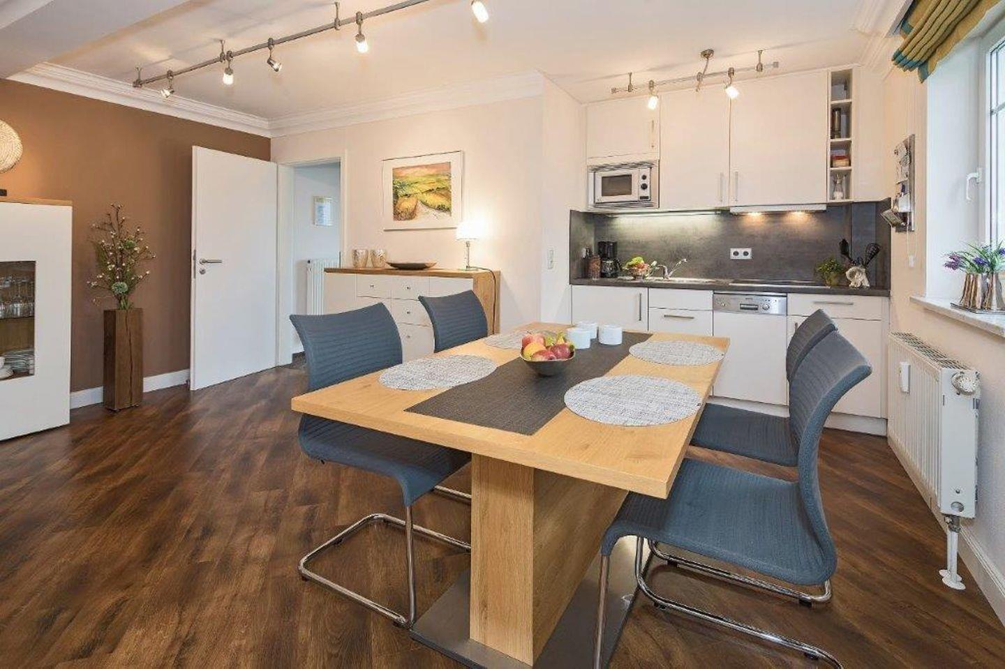 Die Ferienwohnung umfasst einen Windfang, ein helles Wohn- und Esszimmer mit integrierter, moderner Küche, ein separates Schlafzimmer und ein Badezimmer mit Dusche/WC. Ergänzt wird das Angebot durch einen charmanten Balkon, der mit einer Markise ausgestattet ist und somit auch an sonnigen Tagen einen angenehmen Aufenthalt ermöglicht.