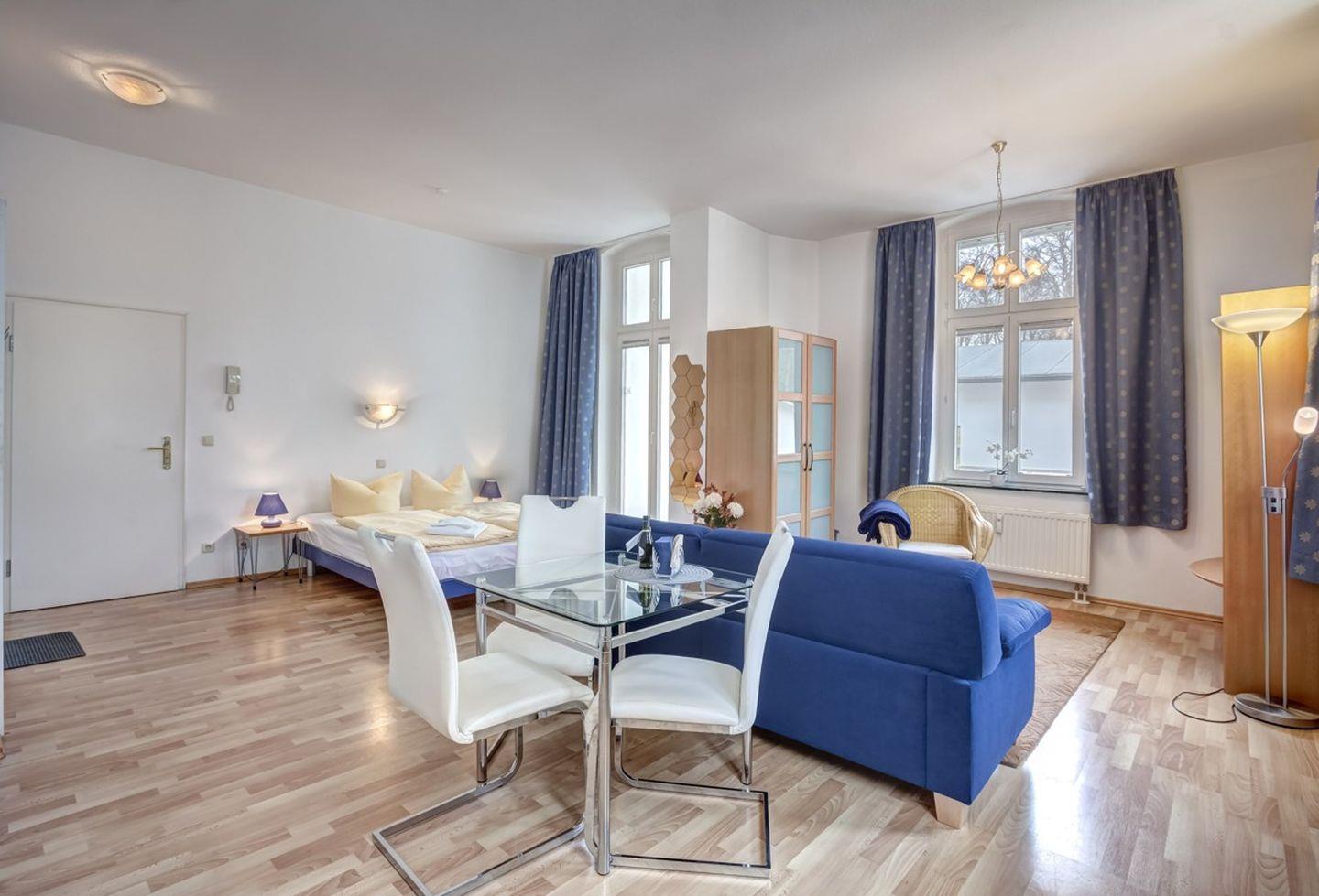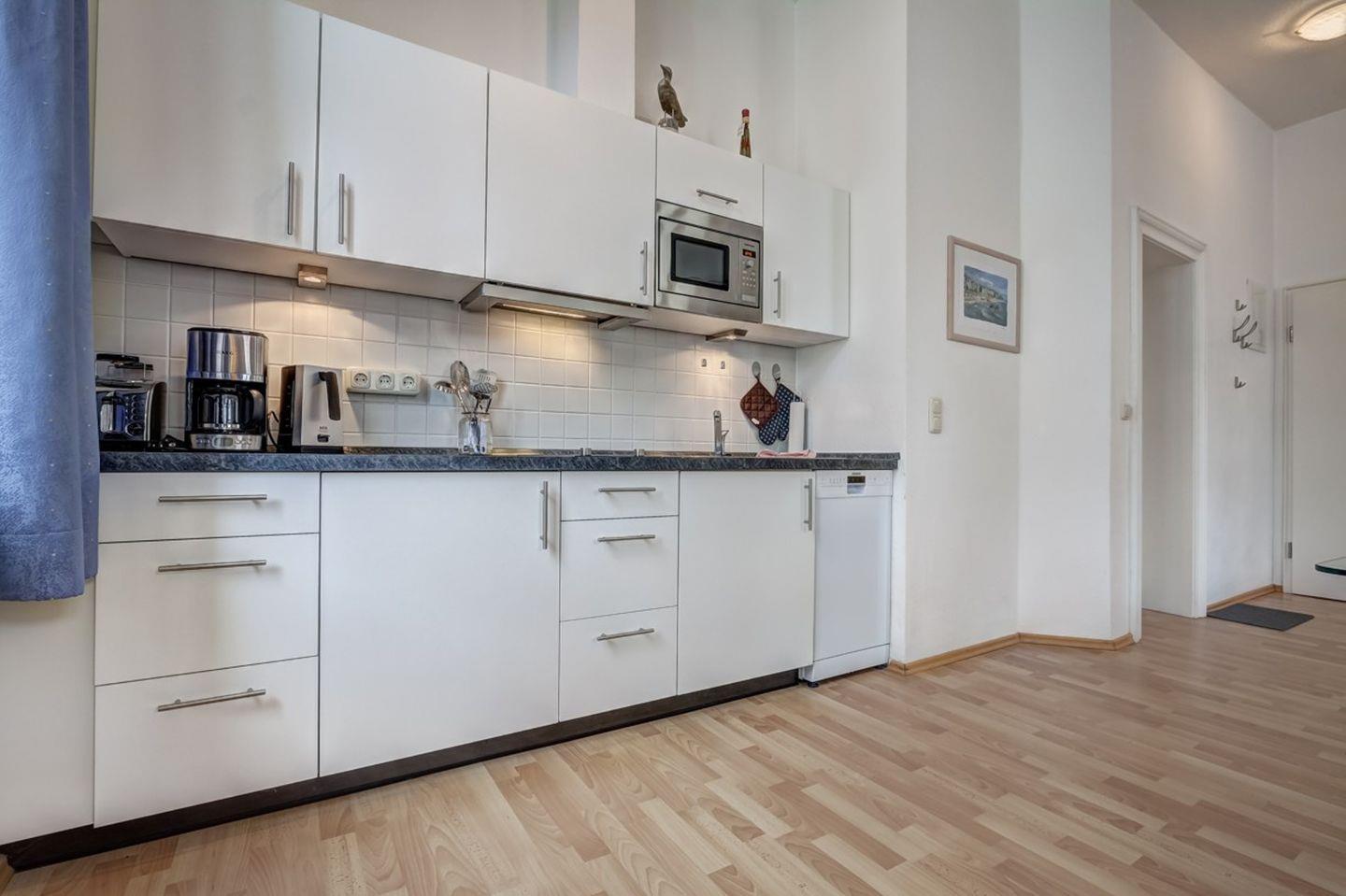 Die Wohnung ist ideal für 2 Personen und bietet einen gemütlichen kombinierten Wohn- und Schlafbereich. Zur Ausstattung gehören eine komplett eingerichtete Küchenzeile und ein separater Essplatz. Eine komfortable Sitzgruppe lädt zum Entspannen ein, und von hier aus haben Sie Zugang zum Balkon in sonniger Süd-West-Lage – perfekt, um die frische Meeresluft und entspannte Stunden im Freien zu genießen.