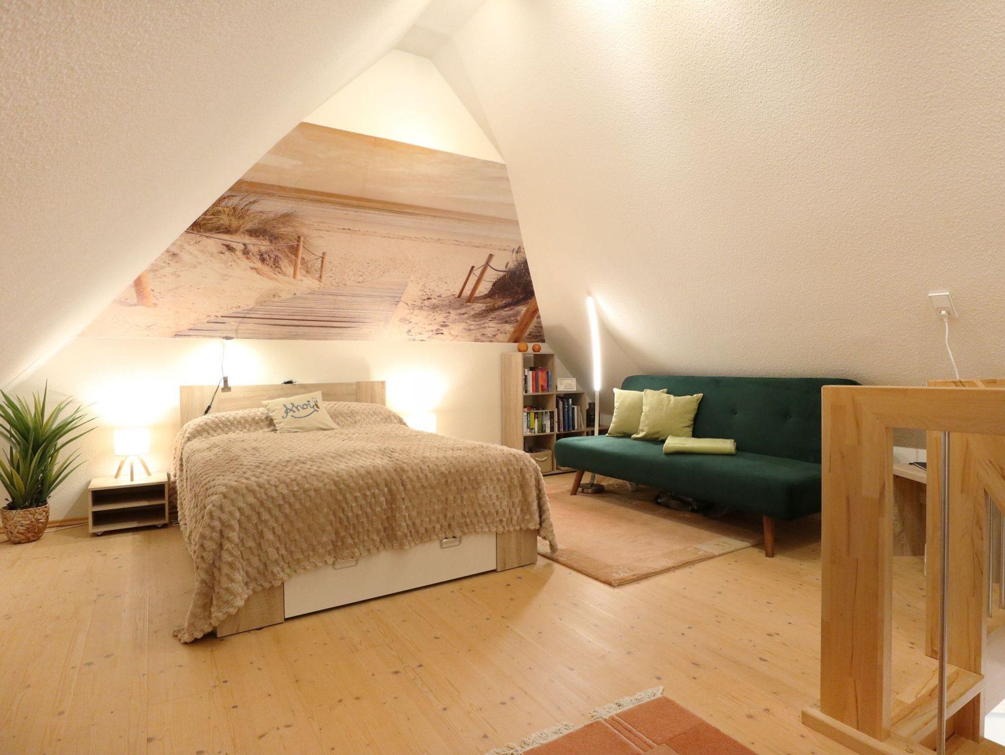 Über eine Raumspartreppe! erreichen Sie den zweiten Schlafbereich, der mit einem Doppelbett, Ruhesessel, kleine Bibliothek und einem Schreibtisch eine weitere Rückzugsmöglichkeit anbietet.