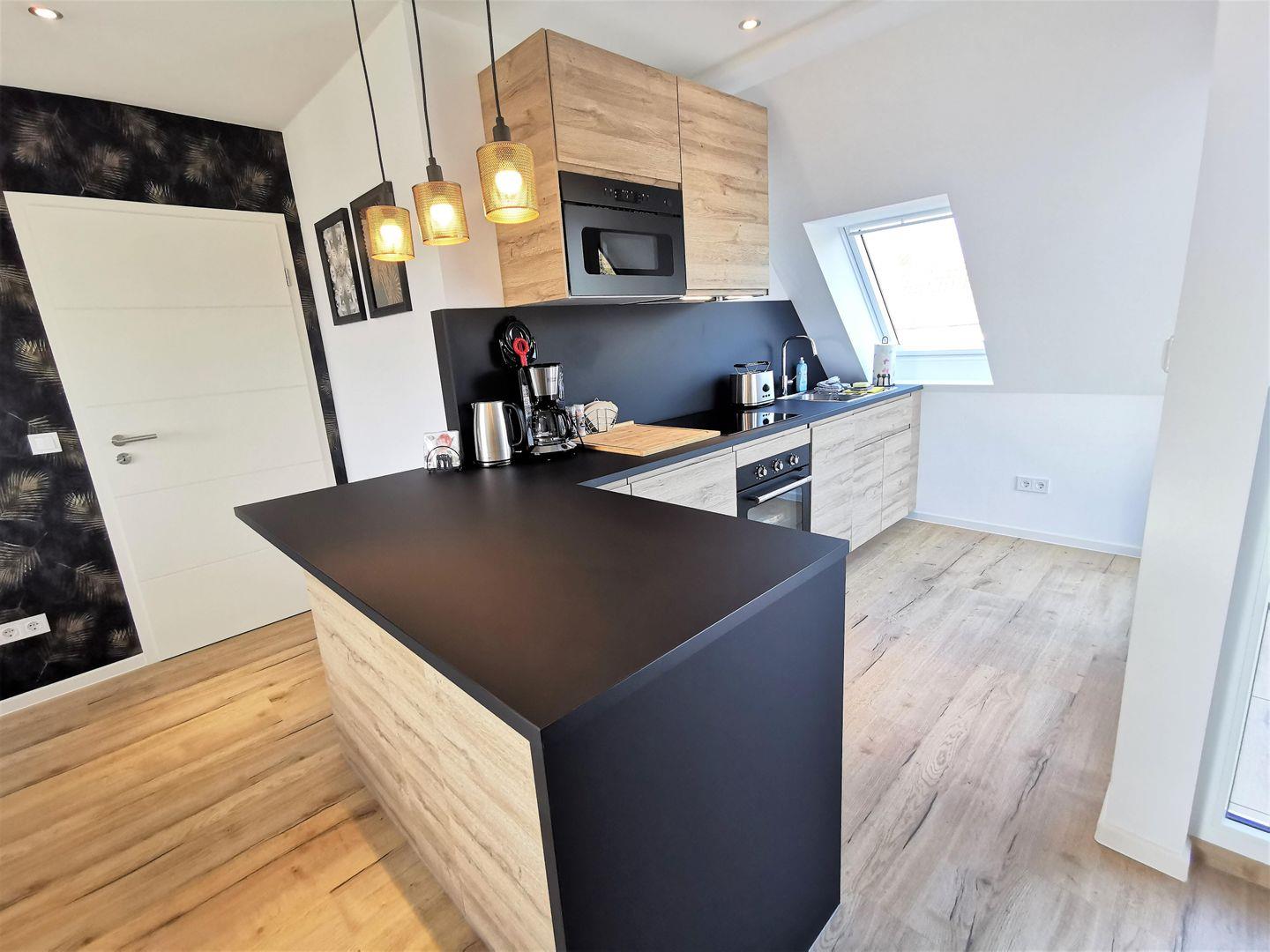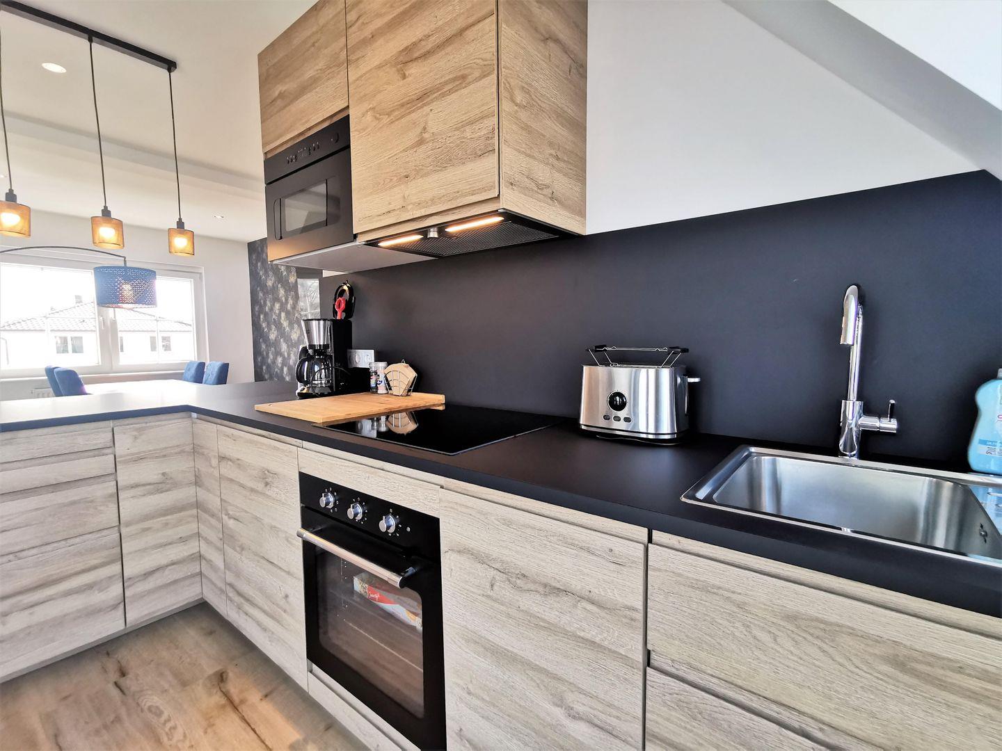 Die offene Küche ist voll ausgestattet, mit allem, was man braucht. Kaffeemaschine, Mikrowelle, Induktionsherd, Geschirrspülmaschine, Backofen, Kühlschrank mit Gefrierfach, Toaster und mehr sind vorhanden.