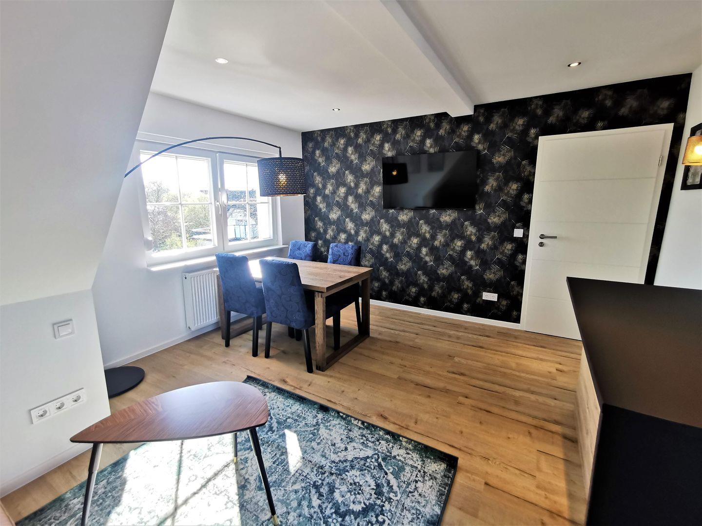 Das helle Wohnzimmer mit Essbereich, Sofa, Sideboard und großem Smart-TV (Streamingdienste mit eigenem Login oder Free TV via Apps) lässt sich auch als weiteres Schlafzimmer nutzen. Das Sofa wird zum bequemen Einzelbetten ausgeklappt.
