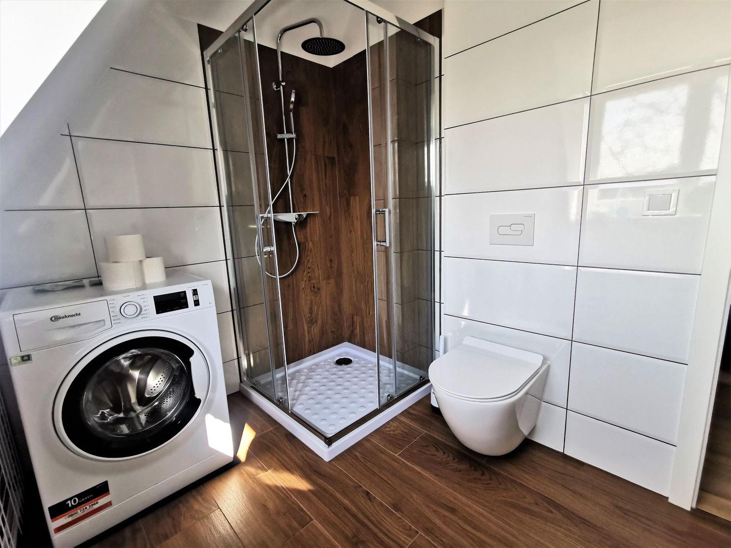 Im Badezimmer befindet sich neben Dusche, Waschbecken und WC ebenfalls die Waschmaschine.