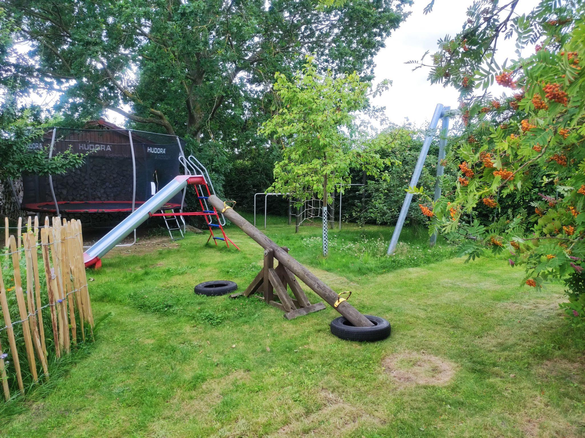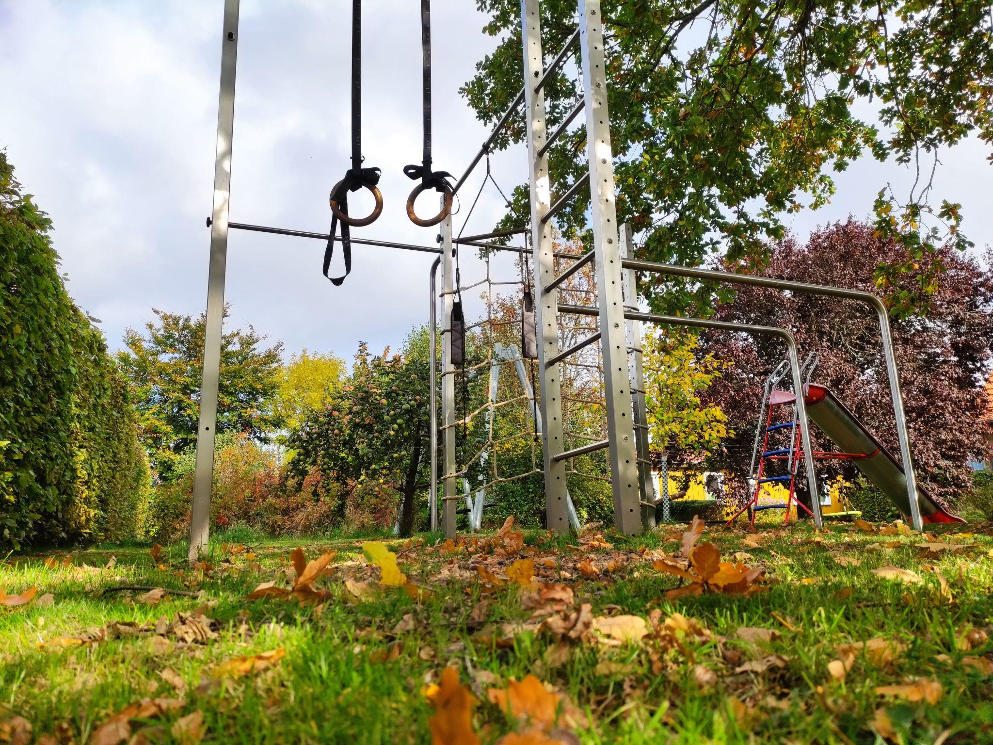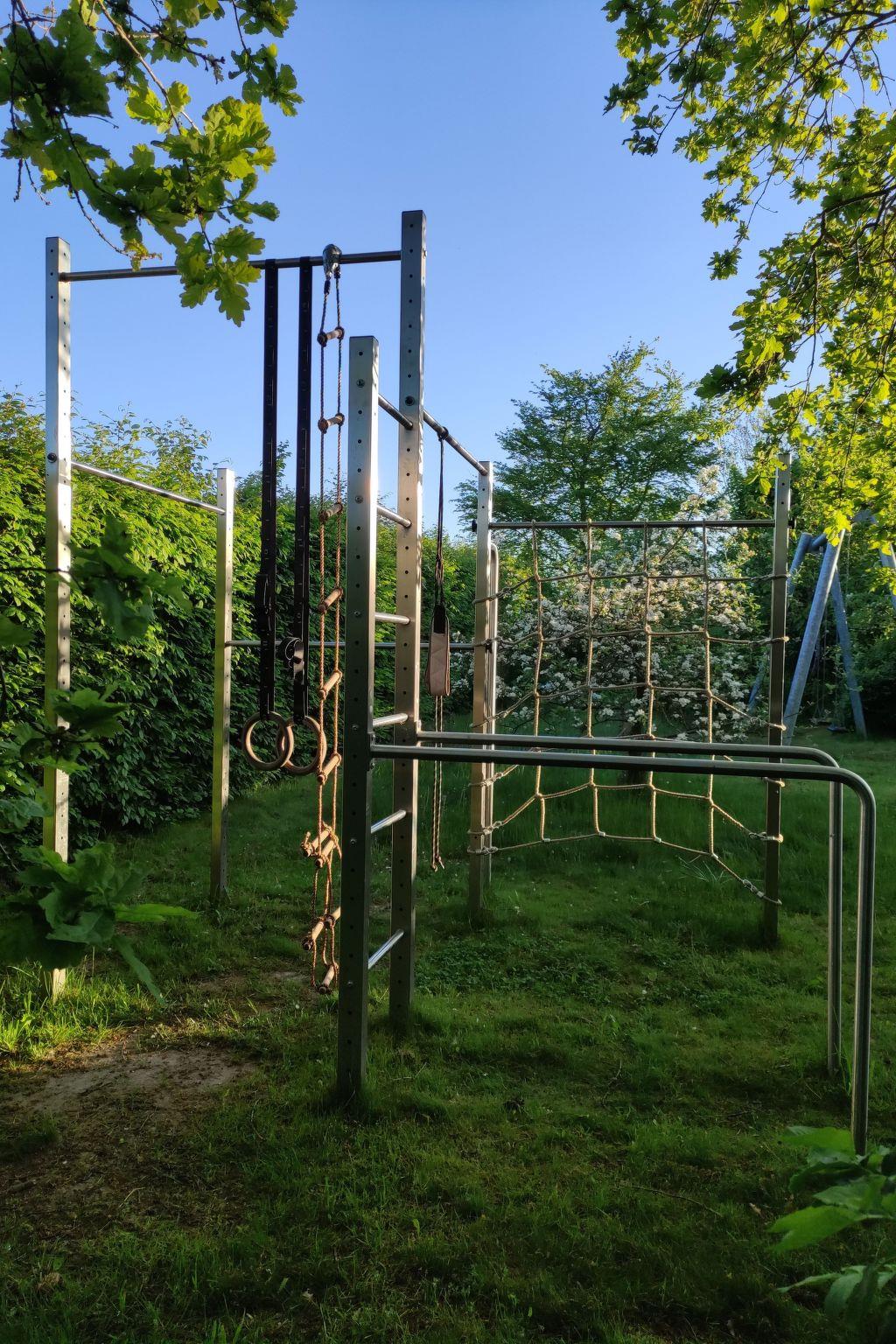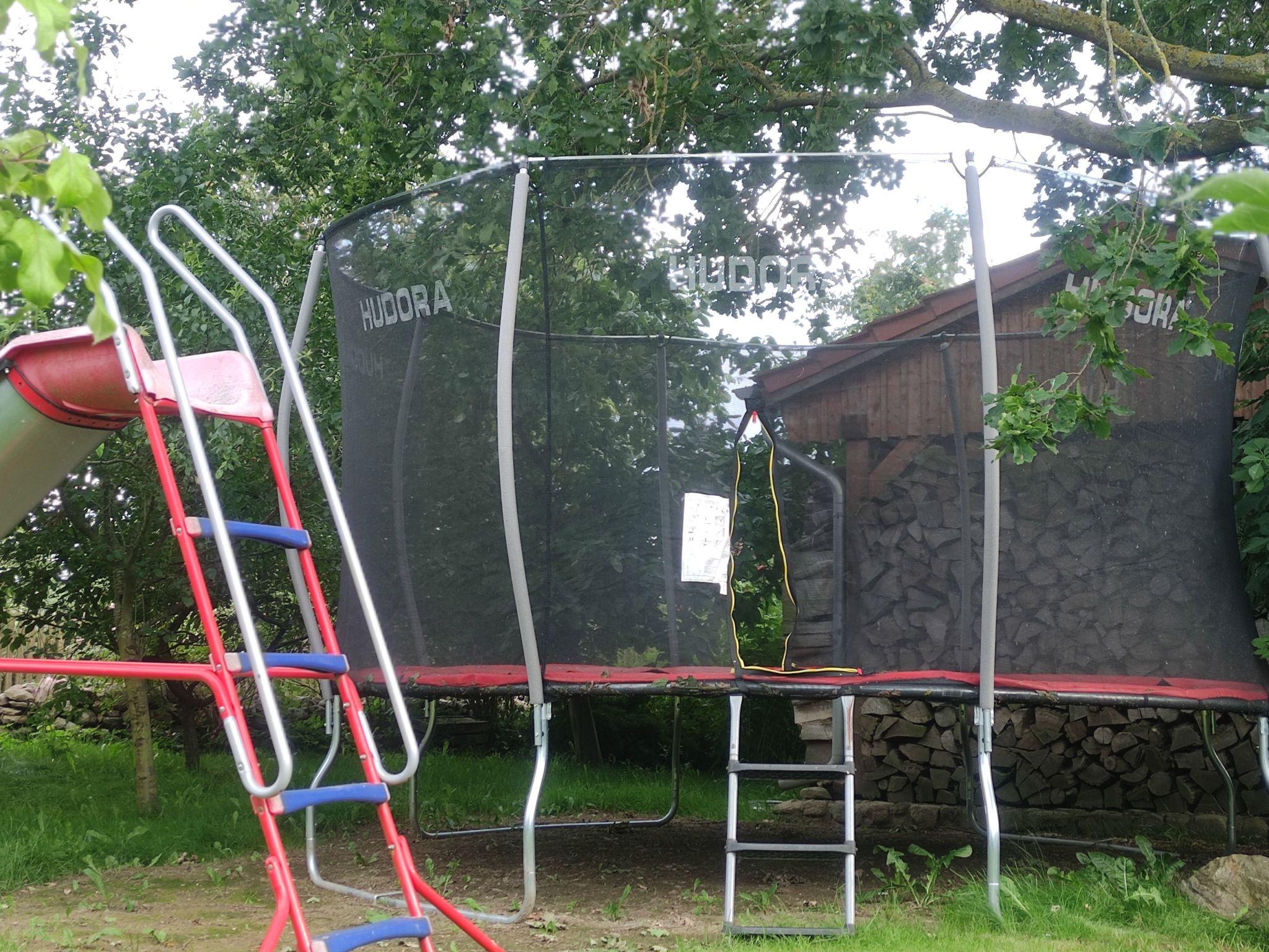 - Playground (also for adults) with - double swing - fitness station with 4 pull-up bars, gymnastic rings, dip bars, rung ladder, human flag pole, climbing net - slide, sandpit, climbing ladder, seesaw, 400 cm TRAMPOLIN