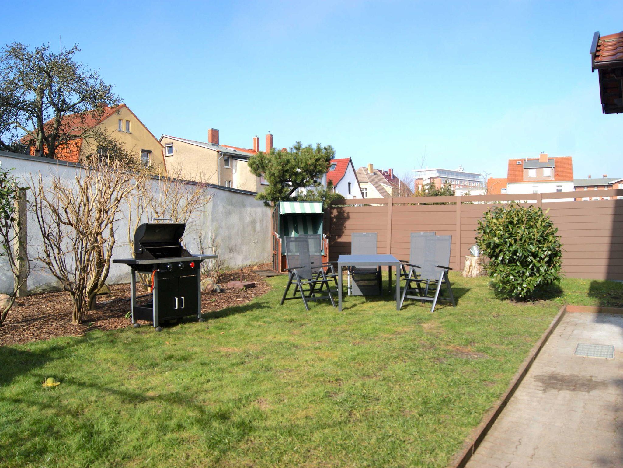 Über sieben Stufen ist die Wohnung im Erdgeschoss/Hochpaterre erreichbar. Der Garten liegt in östlicher Richtung und schützt den möglichen Aufenthaltsbereich durch einen Sichtschutz. Hier befindet sich auch der Strandkorb und die Aufnahme für die Wäschespinne. Die abschließbare Garage beherbergt einen Gasgrill, Gartenmöbel und die Wäschespinne. Dort besteht auch die Möglichkeit Fahrräder sicher unterzubringen. Im Kellergeschoss, mit ca. 1,70 m Deckenhöhe, befindet sich außerdem noch eine Waschmaschine, sowie ein Trockner. Es steht ein Stellplatz vor der Garageneinfahrt zur Verfügung.
