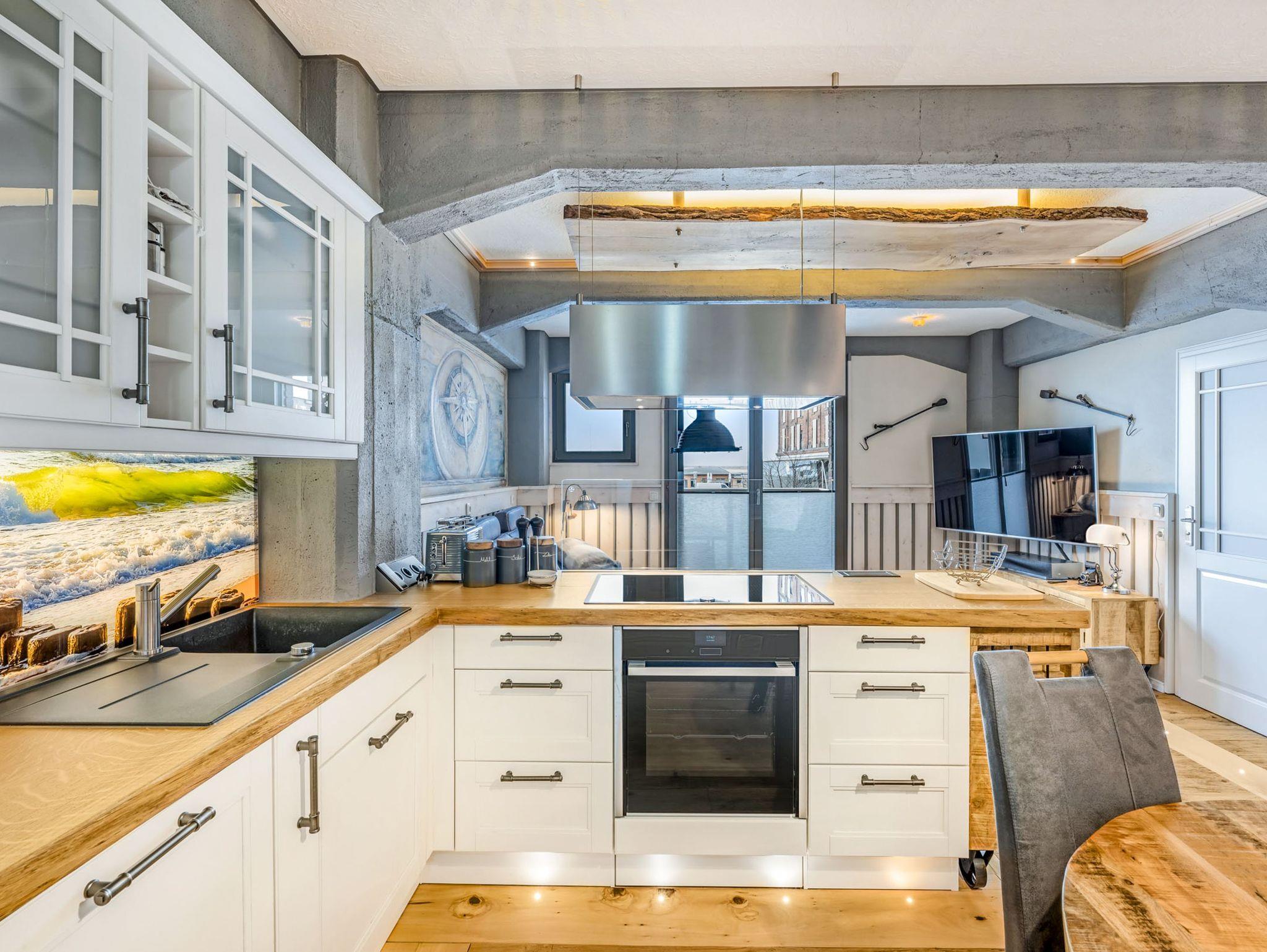 Die Ferienwohnung Lütt Haven überzeugt durch eine klare Raumaufteilung, hochwertige Materialien und ein stimmiges maritimes Wohnkonzept. Der offene Wohn- und Essbereich bildet das Zentrum der Wohnung. Eine großzügige Couch, ein großer TV und der direkte Zugang zum Balkon laden zum Entspannen ein. Mit Blick auf den Hafen und das ruhige Treiben am Wasser kannst du hier ein stärkendes Frühstück genießen oder einen erlebnisreichen Tag ausklingen lassen. Für entspannte Abende steht dir kostenfreies Streaming zur Verfügung, das du ganz unkompliziert nutzen kannst. Die offene Küche ist hochwertig ausgestattet und bietet dir mit großem Kochfeld, Backofen, Mikrowelle, Spülmaschine, Kühlschrank und Kaffeevollautomat alles, was du für genussvolle Mahlzeiten benötigst.
