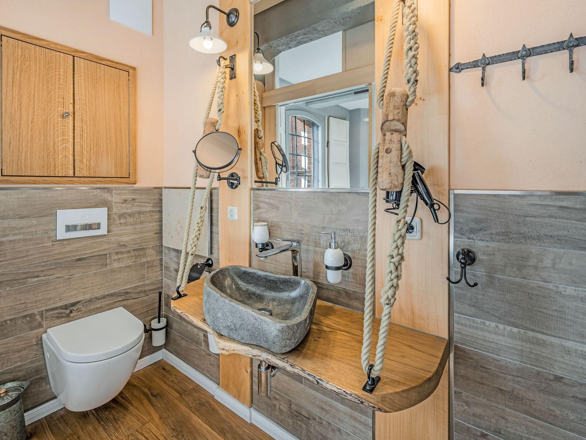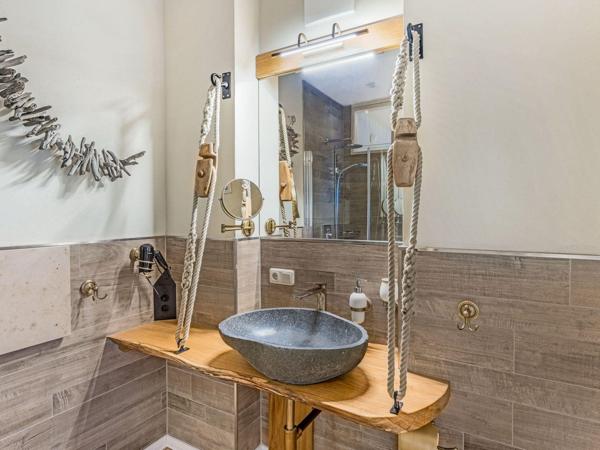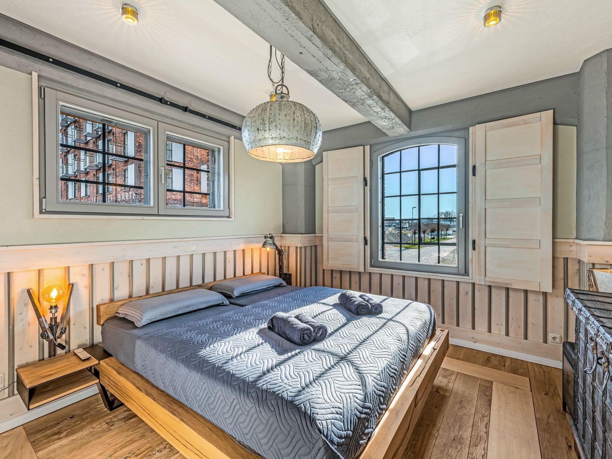 Beide Schlafzimmer sind mit komfortablen Doppelbetten ausgestattet, bestehend aus zwei Matratzen (90x200) mit unterschiedlichen Härtegraden. So findest du ganz individuell deinen persönlichen Schlafkomfort. Eines der Schlafzimmer verfügt über ein Bad en suite, das zweite Bad ist separat zugänglich. Beide Bäder sind modern gestaltet und jeweils mit WC sowie einer ebenerdigen Regendusche ausgestattet. Die Einrichtung ist bewusst martim und hochwertig gehalten und unterstreicht den besonderen Charakter des historischen Speichergebäudes.