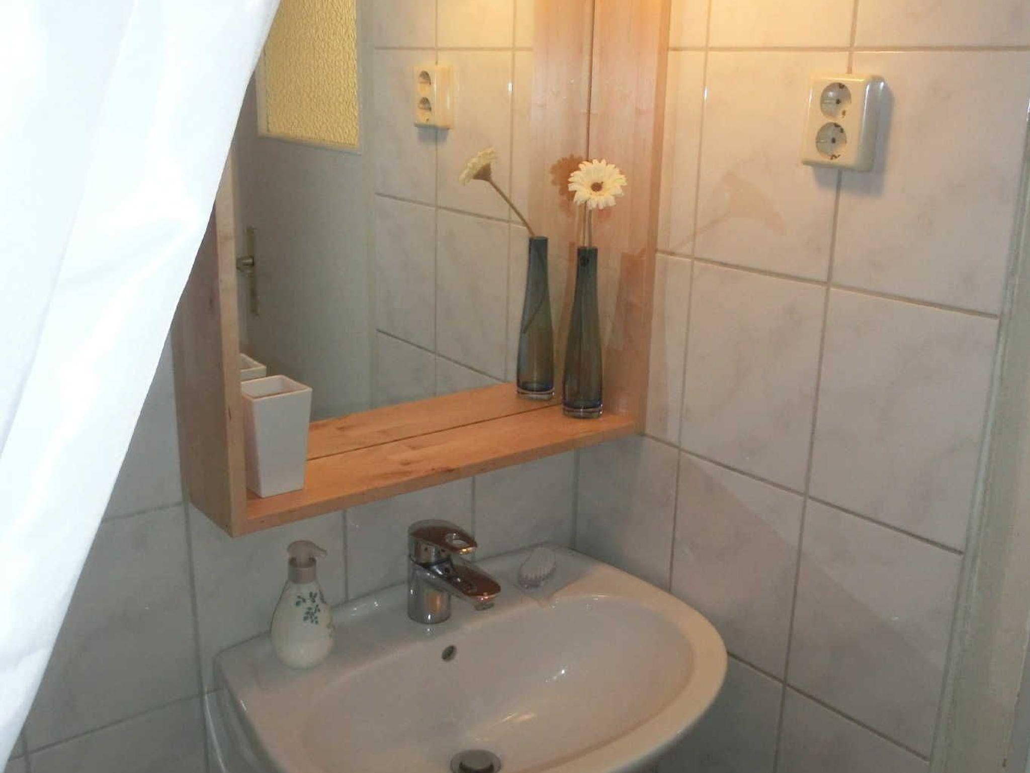 Bad mit Dusche, WC, Ablage für persönliche Utensilien.