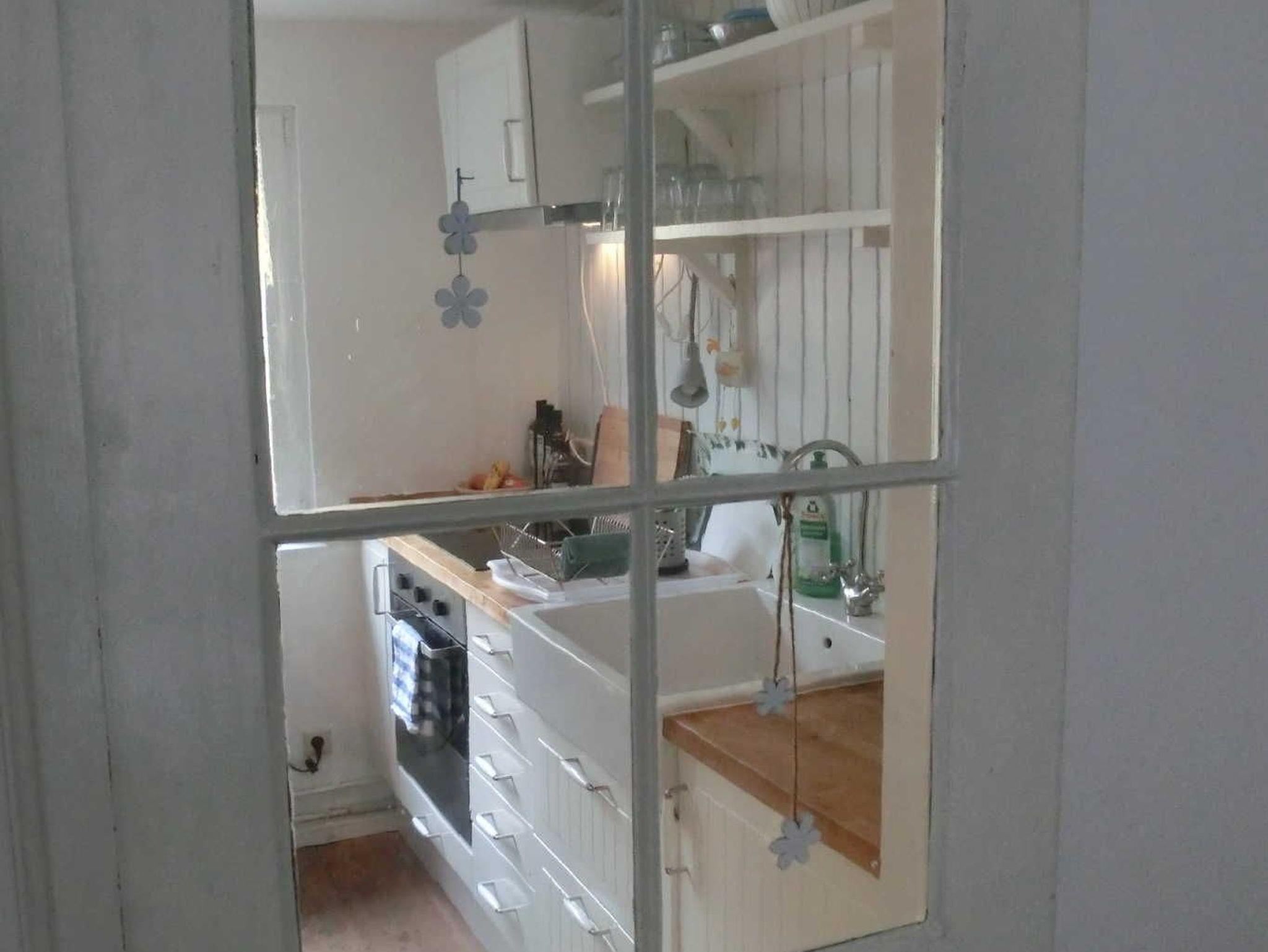 Komplett eingerichtete Küche mit großem ausklappbaren Esstisch, Spüle, Kühl,- und Gefrierkombination, Wasserkocher, Toaster, Kaffeemaschine, 4 Induktionskochfelder, Porzellan, Gläser, Besteck, Töpfe, Bügeleisen, Geschirr- und Küchentücher.