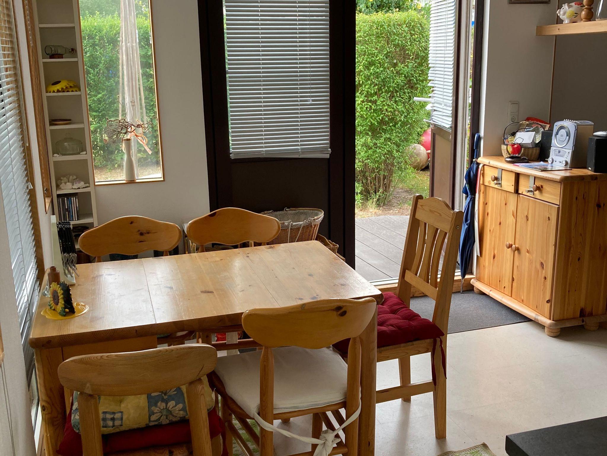 Vom Esstisch aus haben Sie einen schönen Blick in den von einer Hecke umgebenen Garten mit Gartenmöbeln und Sitzpolstern. Schräg gegenüber des Bungalow-Eingangs befindet sich ein kleiner Teich mit Goldfischen.