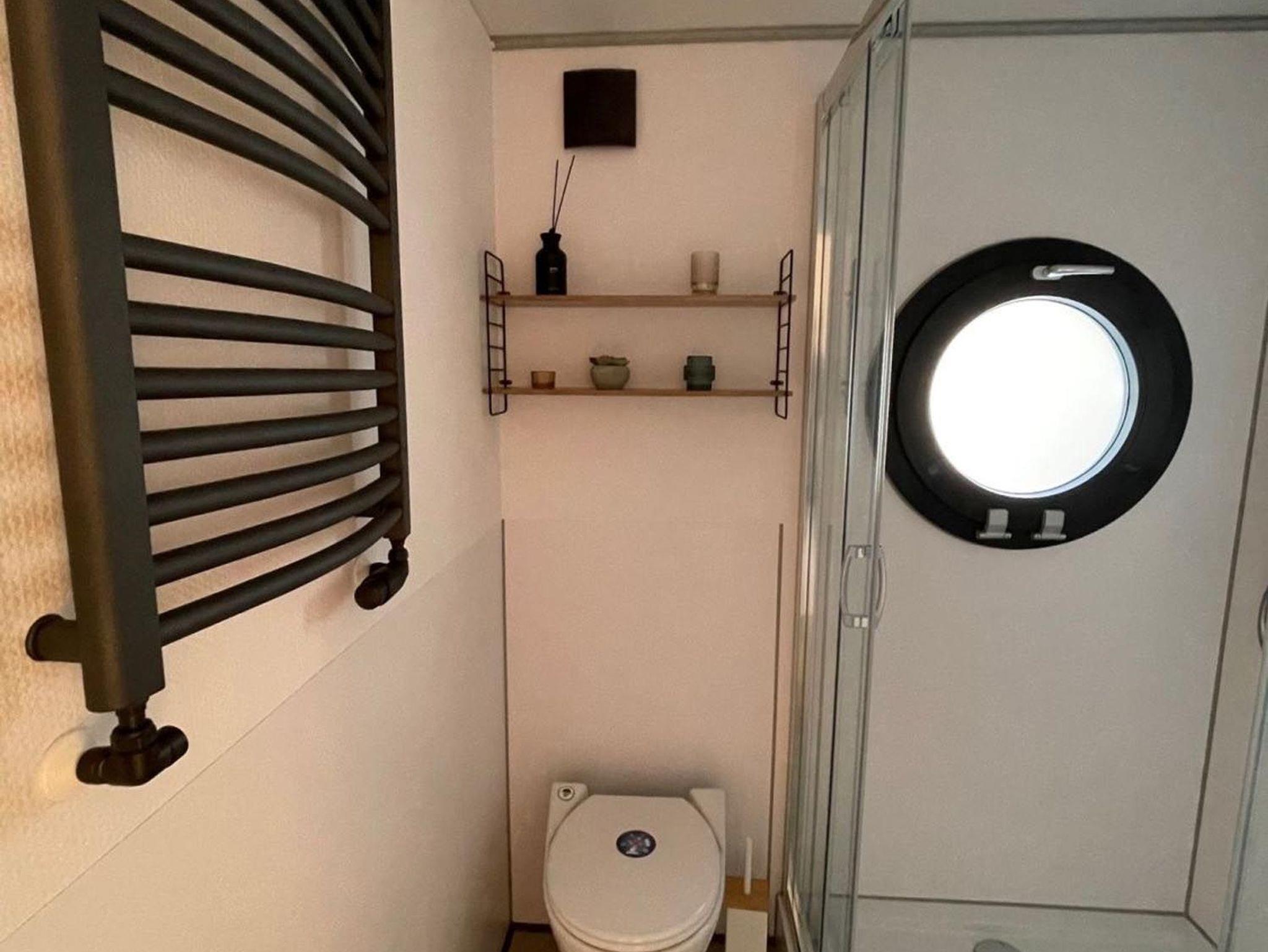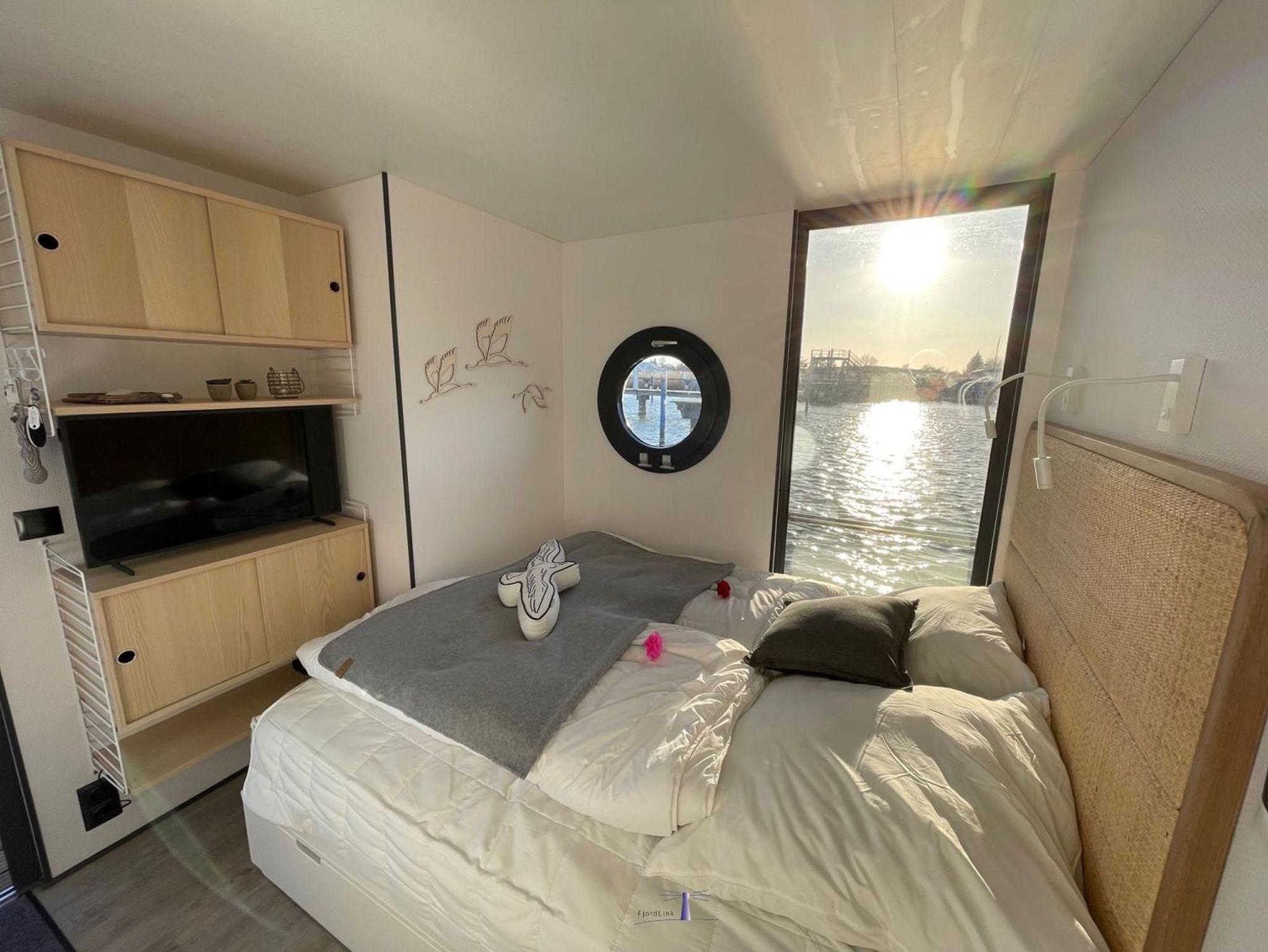 Im Inneren des Hausbootes finden Sie neben dem Wohnraum mit Fußbodenheizung für kalte Tage zwei Schlafräume mit je einem Doppelbett sowie ein modernes Duschbad. Genügend Stauraum finden Sie in den Schränken sowie in den Schubladen unter den Betten.