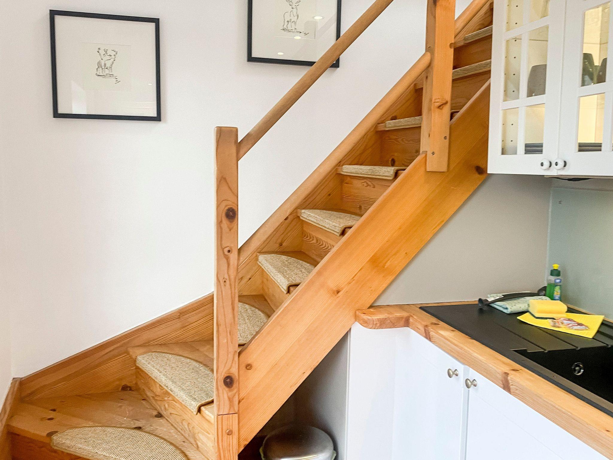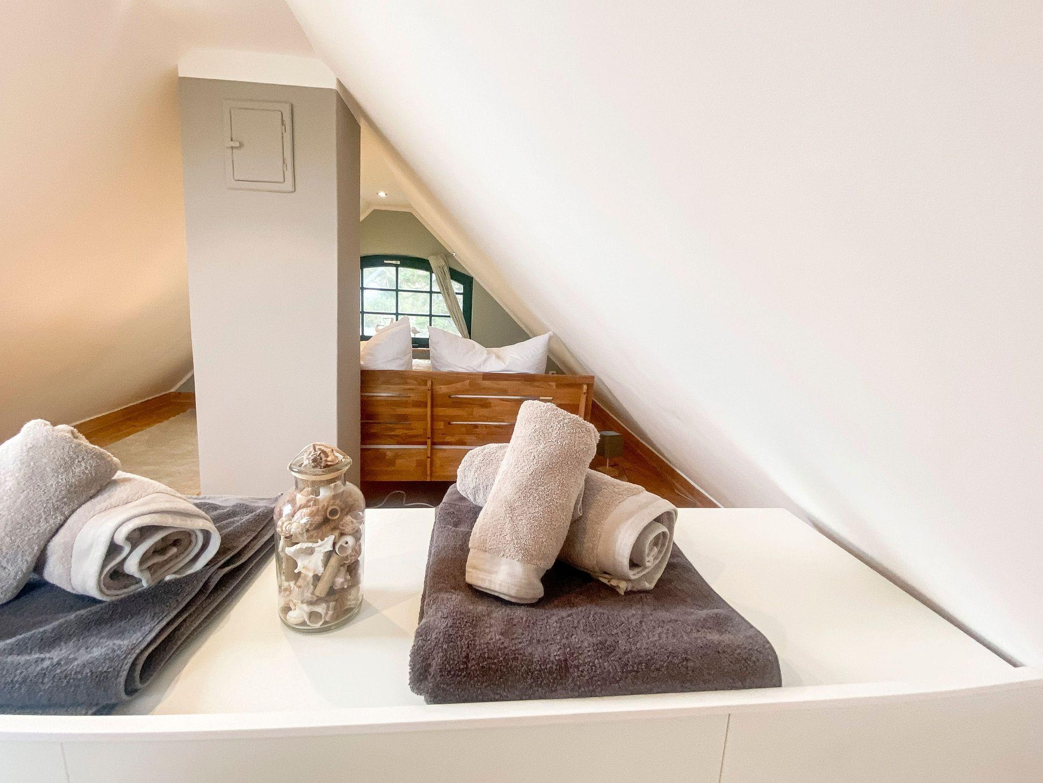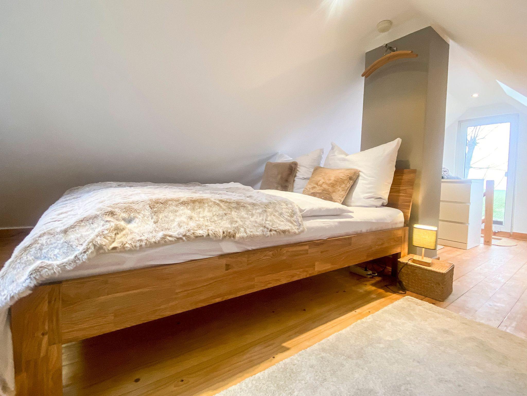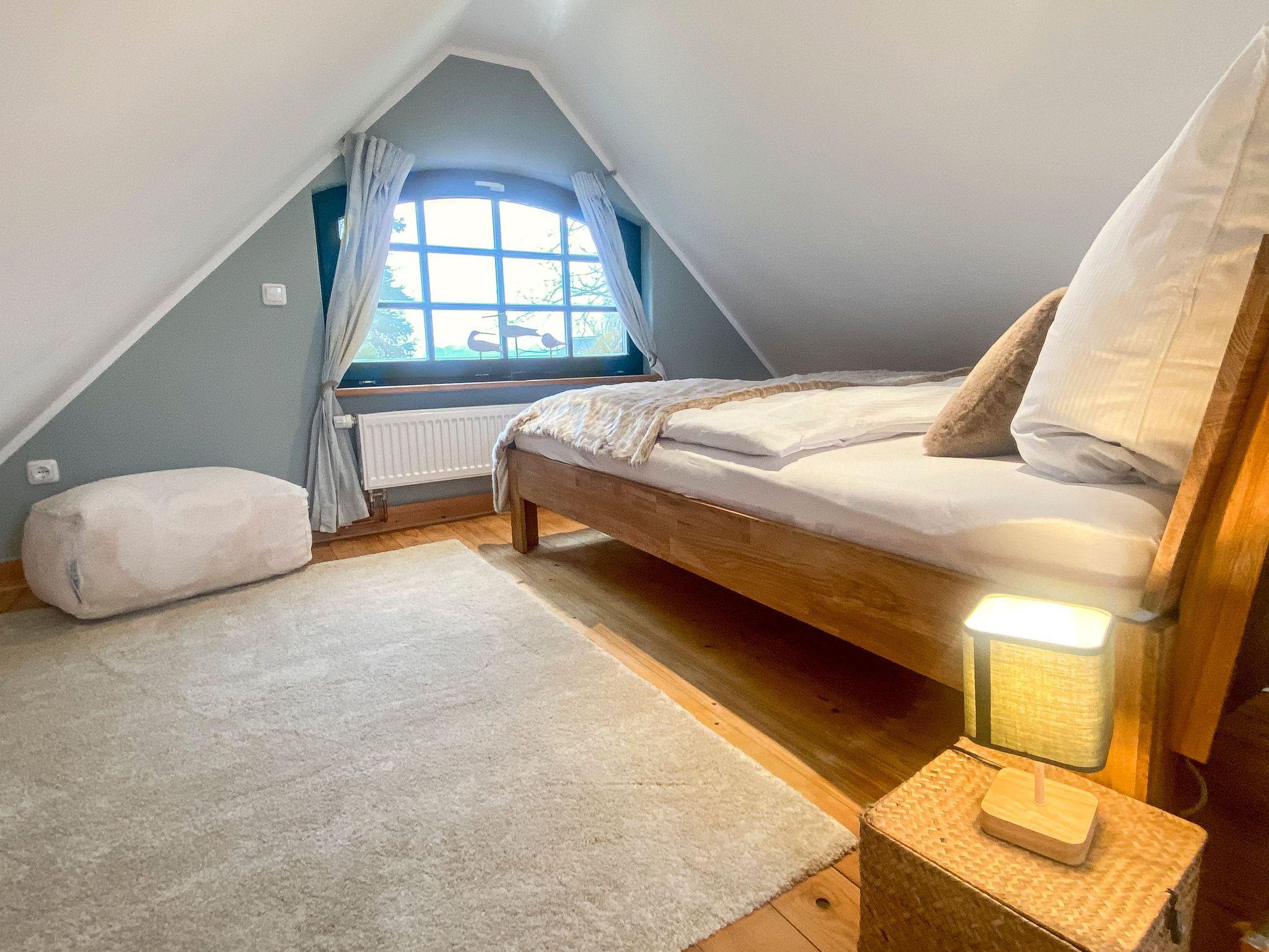 Eine Treppe führt ins offene Dachgeschoss, wo ein Doppelbett (160x200) als Schlafmöglichkeiten zur Verfügung steht. Für die kleinsten Gäste (bis 2 Jahre) wird gern kostenlos auf Anfrage ein Kinderreisebett zugestellt.