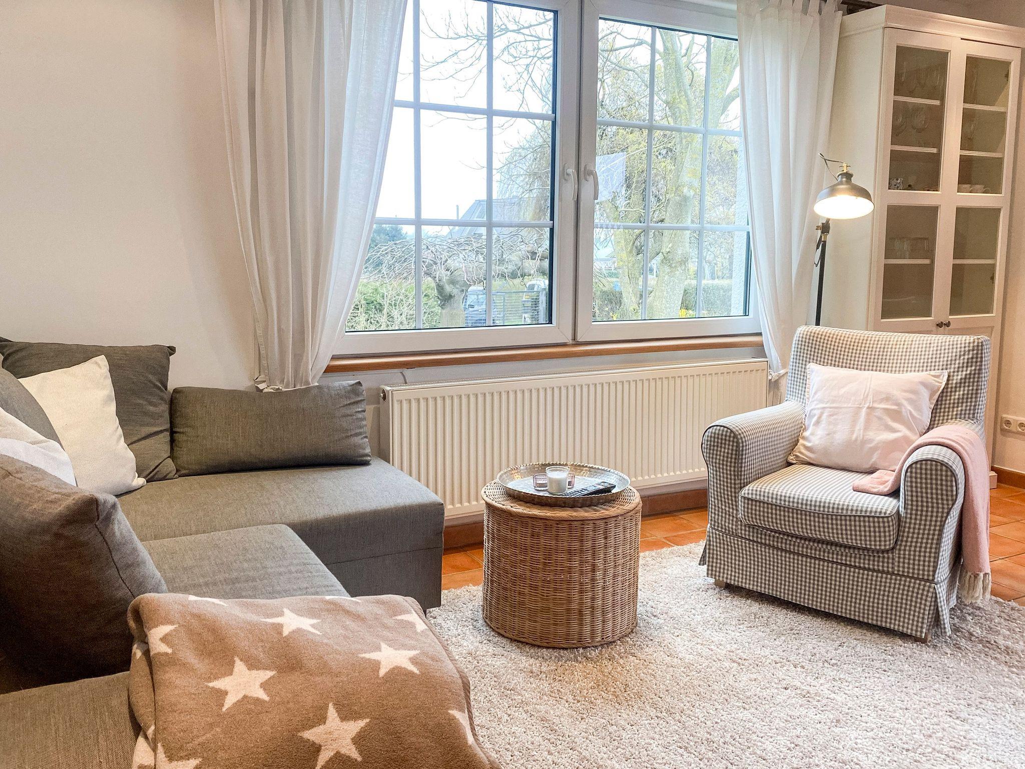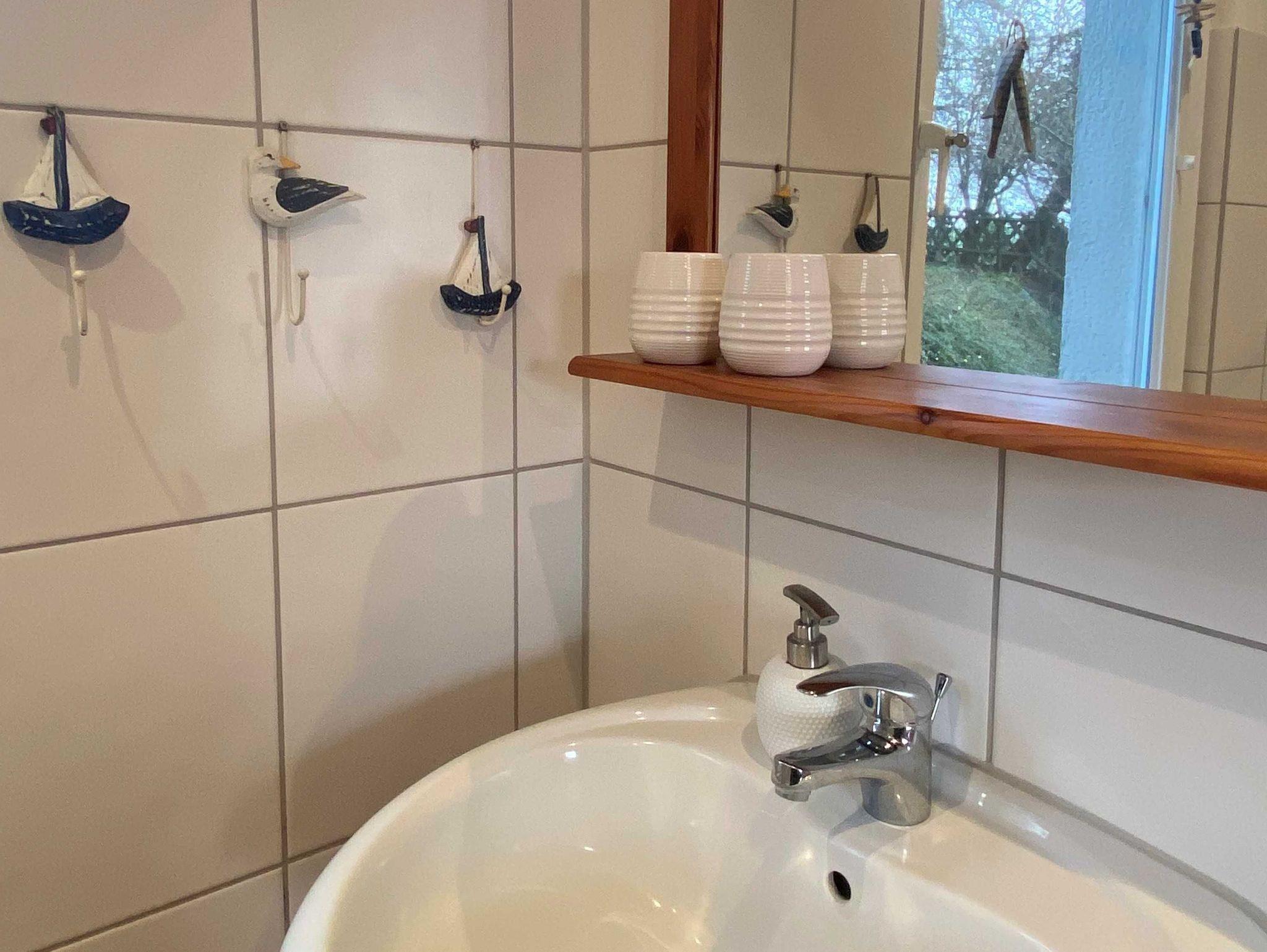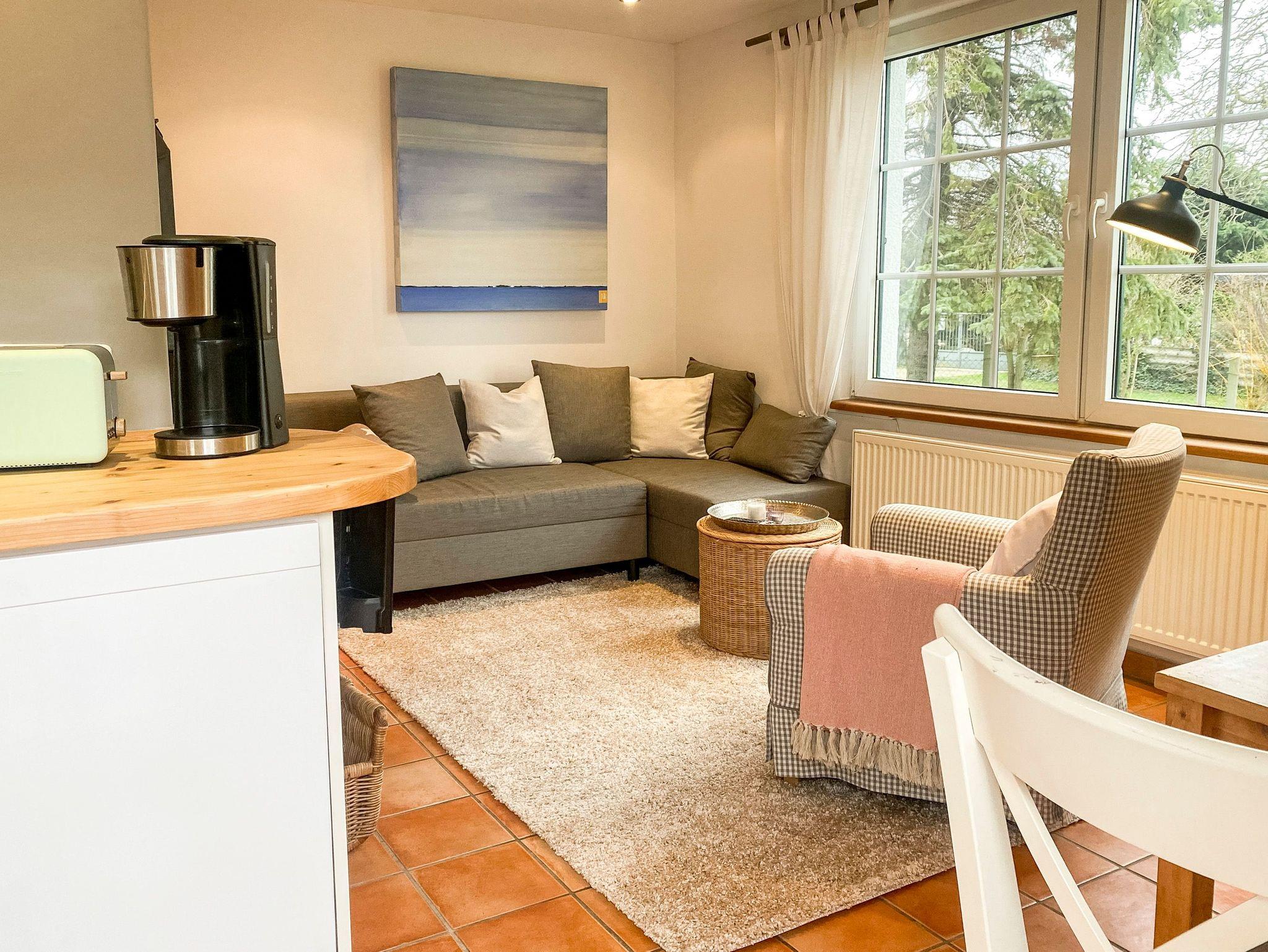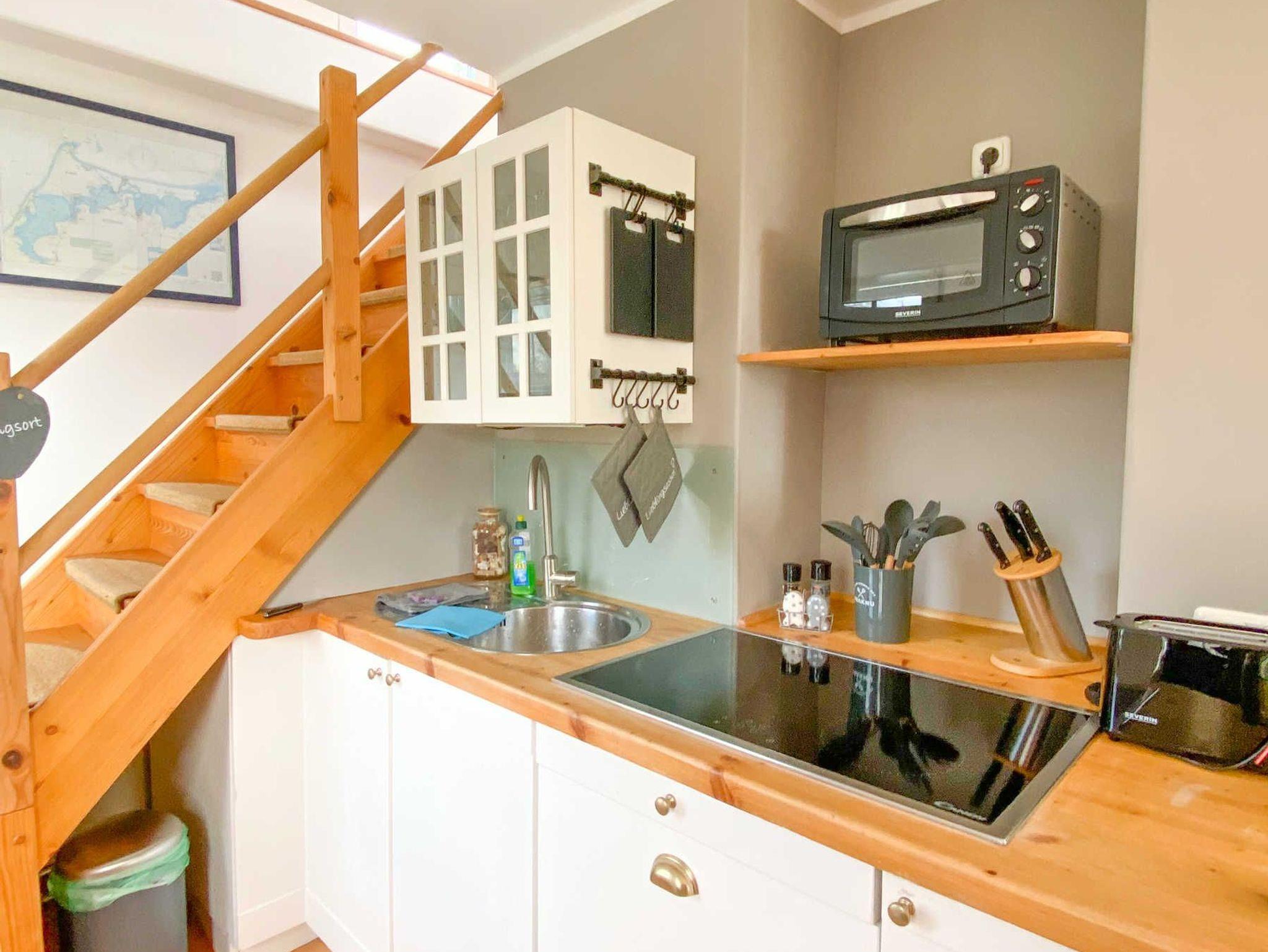 Im Erdgeschoss steht Ihnen ein offener Wohnbereich mit Küche zur Verfügung, welcher liebevoll und geschmackvoll ausgestattet wurde. Die Küche bietet Ihnen ein großes Ceranfeld, Wasserkocher, Senseo-Kaffeemaschine, Kühlschrank mit Gefrierfach und einen kleinen Backofen. Im angrenzenden offenen Wohnbereich mit Schlafsofa (140x200), TV und Kaminofen können Sie den Blick in den Garten mit Gartenteich bis hin zum Bodden genießen.