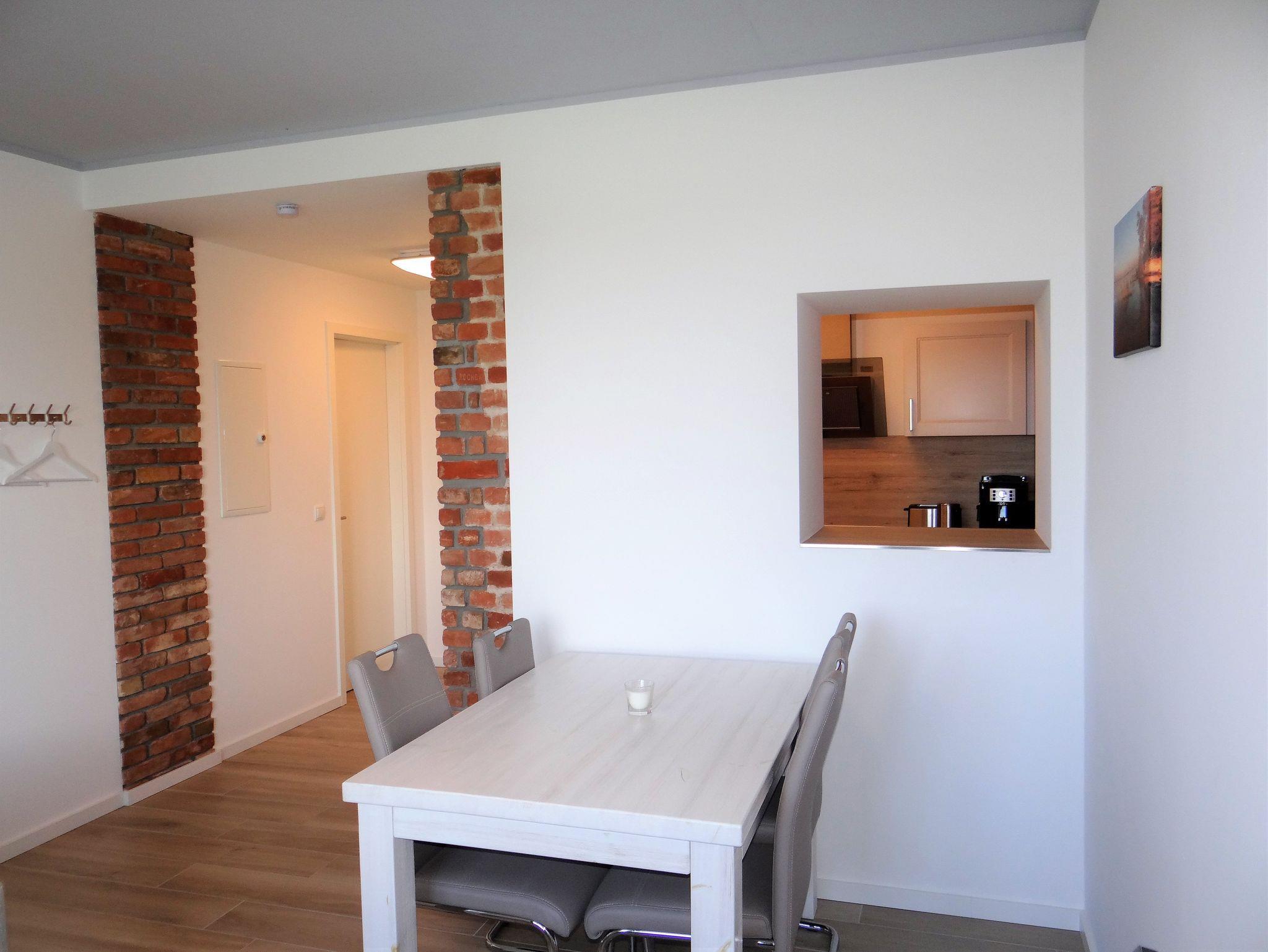 Schlafzimmer mit Boddenblick, Wohnzimmer mit Balkon, Esstisch mit Durchreiche zur offenen Einbauküche mit hochwertiger Küchenausstattung; Kaffeeautomat (Bohnen und Pulver), Backofen inkl. Mikrowelle und Grillfunktion, Geschirrspüler.