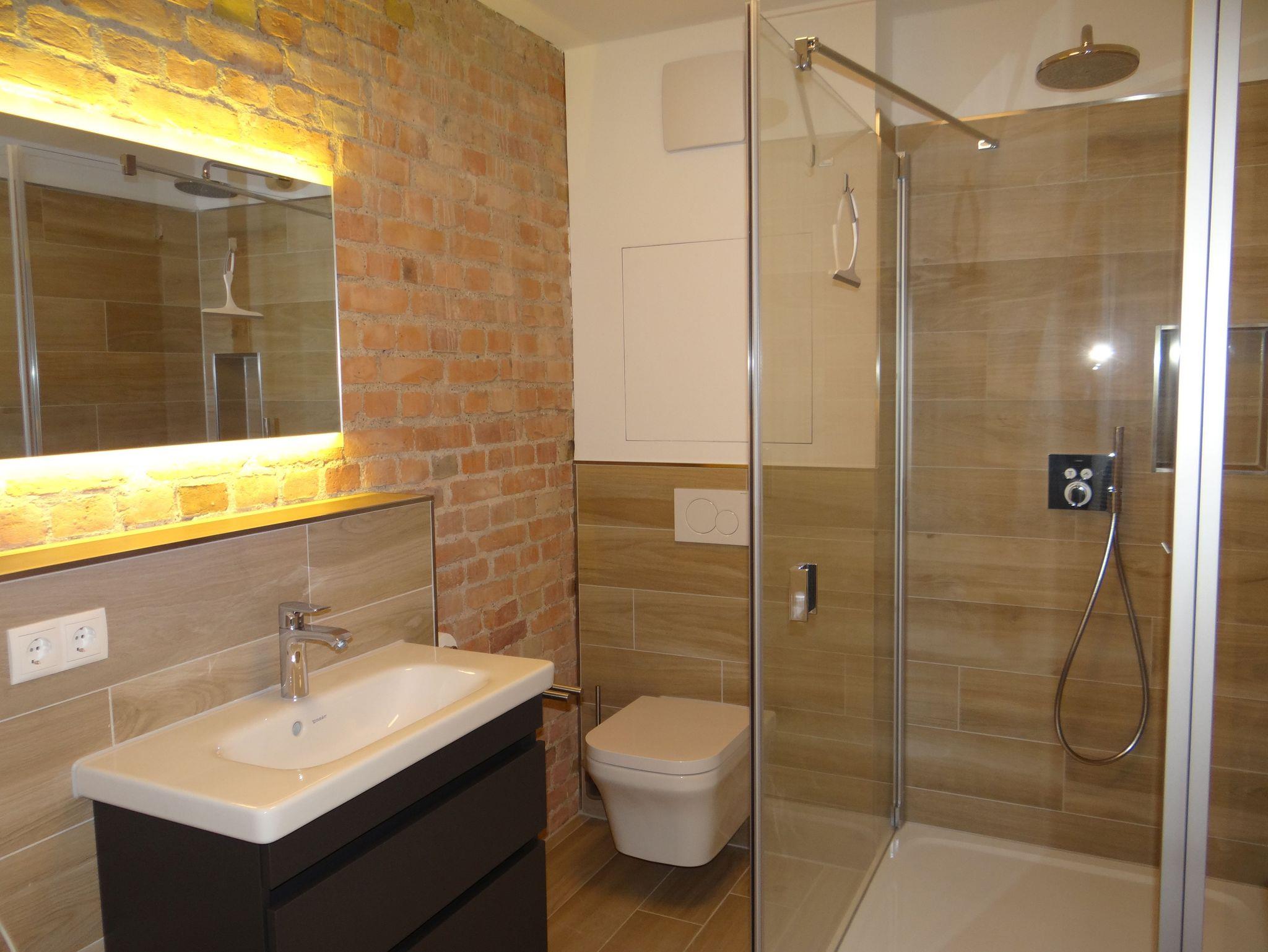Bad mit ebenerdiger Dusche, Klimaanlage, Fliesenboden in Holzoptik.