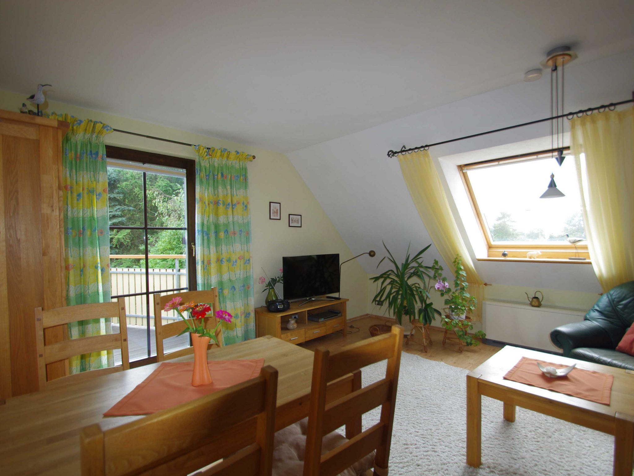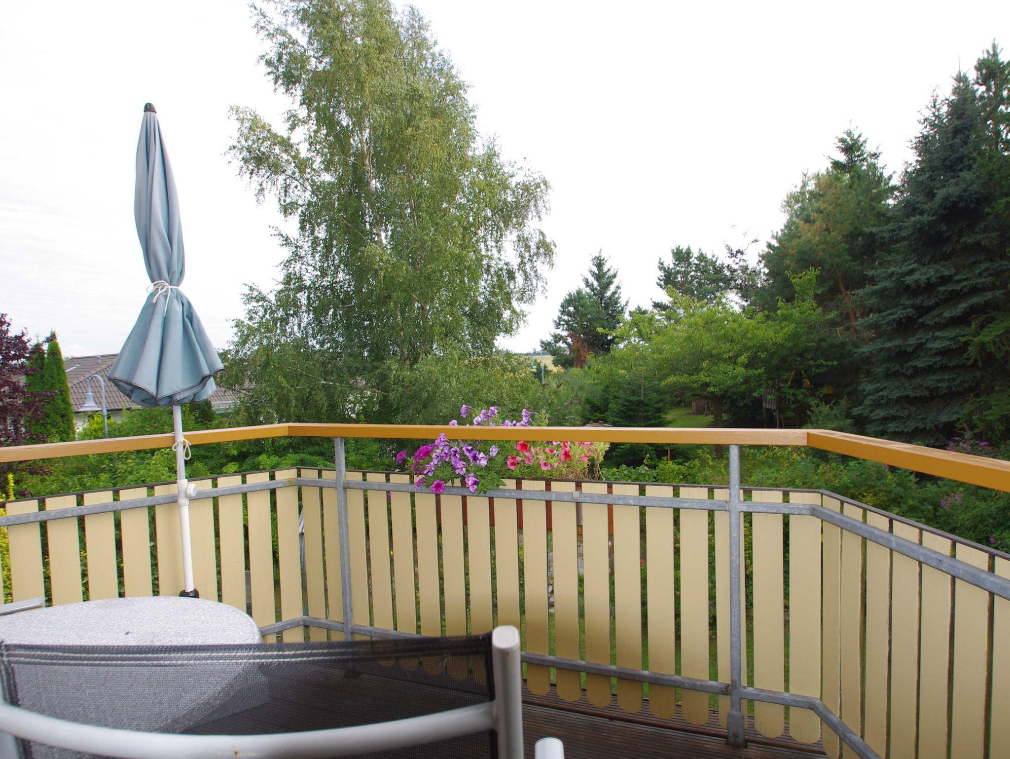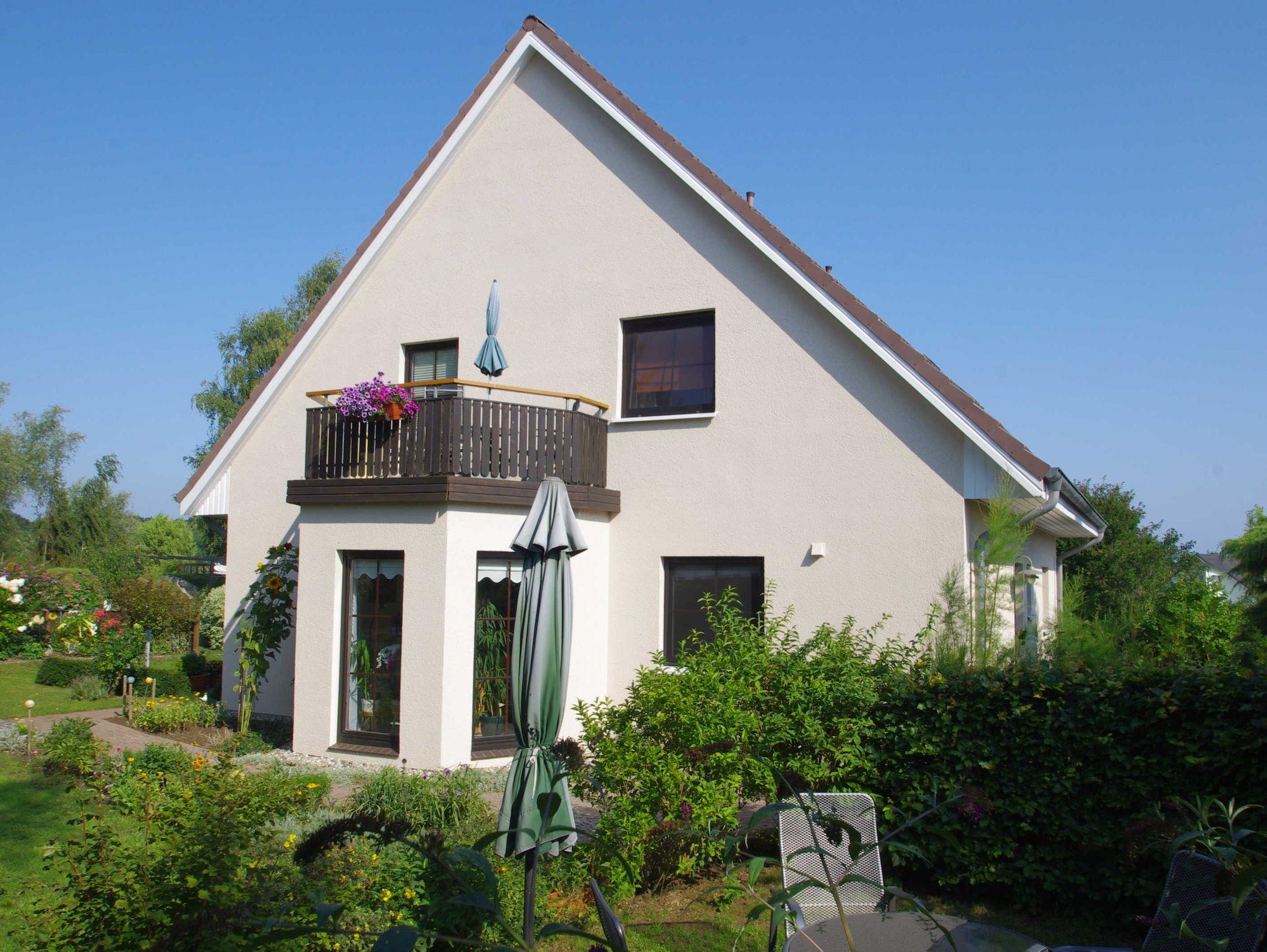 Die Dachgeschoßwohnung mit 65 qm Wohnfläche für 2-4 Personen besteht aus einem Wohnzimmer, 2 Schlafzimmern mit Doppelbetten (Kinderbett, Kinderstuhl, vorhanden auf Anfrage), komplett eingerichtete Küche, Bad mit Dusche/WC. Der Balkon mit Tisch, Stühlen und Sonnenschirm ist vom Wohnzimmer aus begehbar. Die Wohnung ist mit TV, Radio (CD,DVD) Fön und WLAN ausgestattet. Im Garten ist ein Bereich zum Sonnen, Grillen und Spielen. PKW Parkplatz und Unterstellmöglichkeit für Fahrräder ist vorhanden.